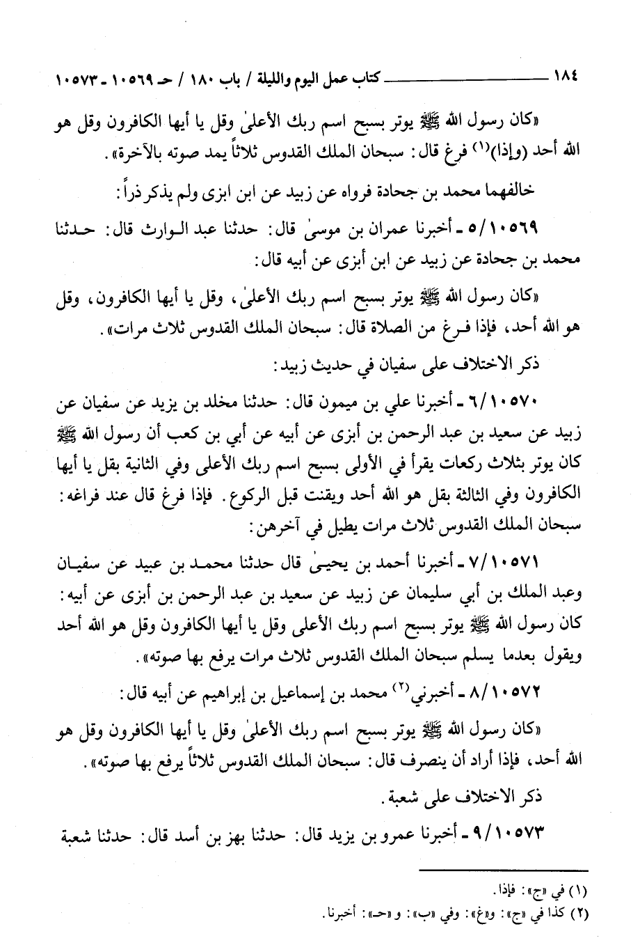 10569 - أخبرنا عمران بن موسى قال حدثنا عبد الوارث قال حدثنا محمد بن جحادة عن زبيد عن بن أبزى عن أبيه قال : كان رسول الله صلى الله عليه و سلم يوتر بسبح اسم ربك الأعلى وقل يا أيها الكافرون وقل هو الله أحد فإذا فرغ من الصلاة قال سبحان الملك القدوس ثلاث مرات ذكر الاختلاف على سفيان في حديث زبيد