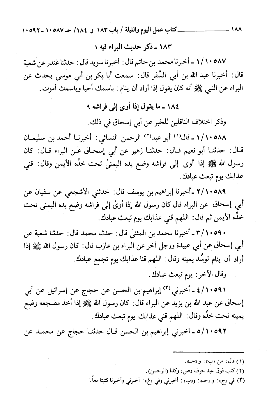 10588 - قال أبو عبد الرحمن النسائي أخبرنا أحمد بن سليمان قال حدثنا أبو نعيم قال حدثنا زهير عن أبي إسحاق عن البراء قال : كان رسول الله صلى الله عليه و سلم إذا أوى إلى فراشه وضع يده اليمنى تحت خده الأيمن وقال قني عذابك يوم تبعث عبادك