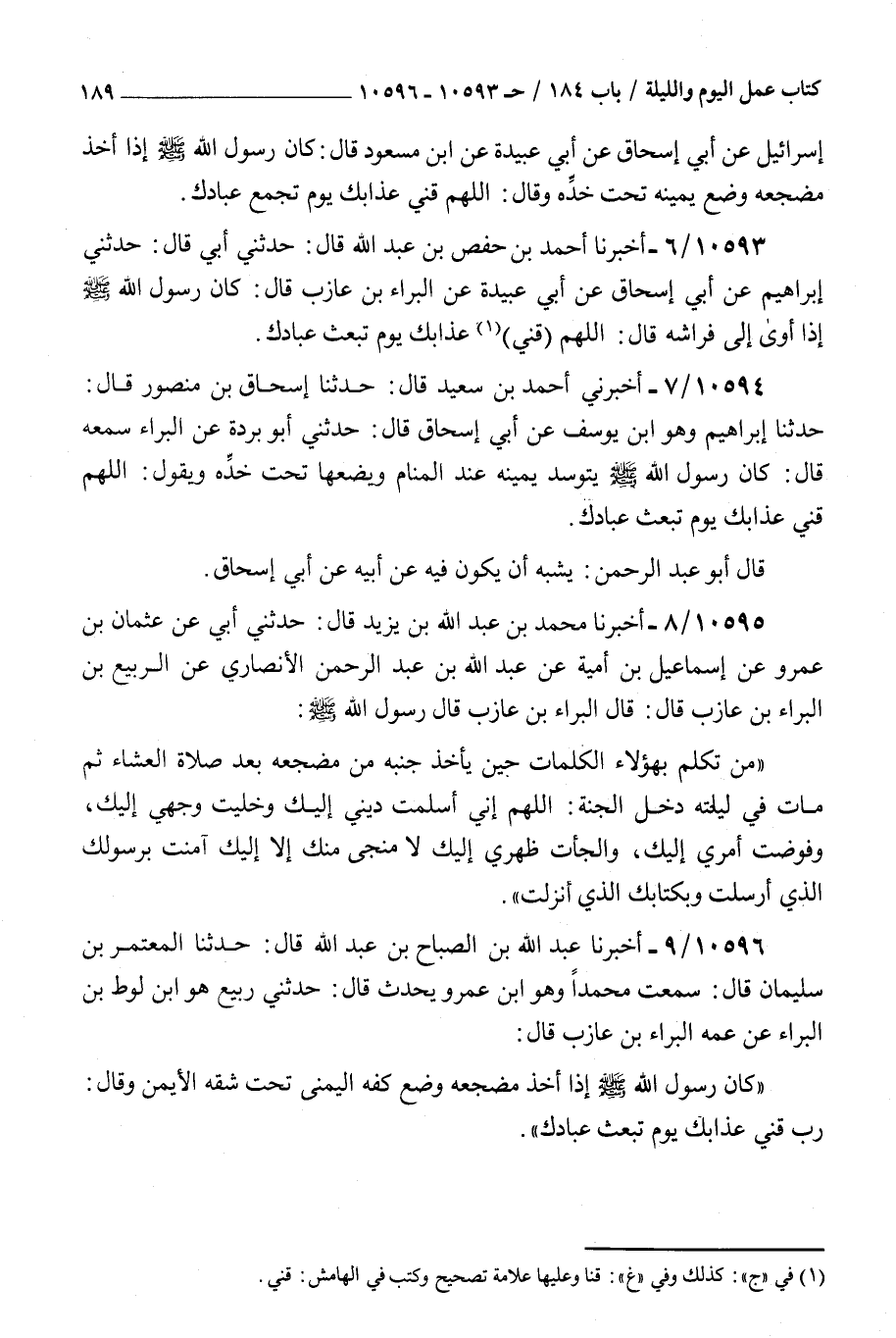 10593 - أخبرنا أحمد بن حفص بن عبد الله قال حدثني أبي قال حدثني إبراهيم عن أبي إسحاق عن أبي عبيدة عن البراء بن عازب قال : كان رسول الله صلى الله عليه و سلم إذا أوى إلى فراشه قال اللهم قني عذابك يوم تبعث عبادك