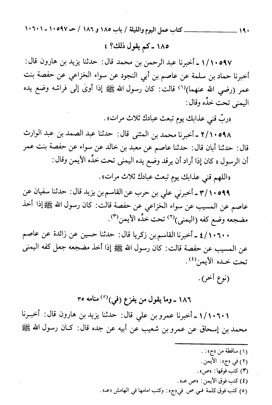 10597 - أخبرنا عبد الرحمن بن محمد قال حدثنا يزيد بن هارون قال أخبرنا حماد بن سلمة عن عاصم بن أبي النجود عن سواء الخزاعي عن حفصة بنت عمر رضي الله عنهما قالت : كان رسول الله صلى الله عليه و سلم إذا أوى إلى فراشه وضع يده اليمنى تحت خده وقال رب قني عذابك يوم تبعث عبادك ثلاث مرات