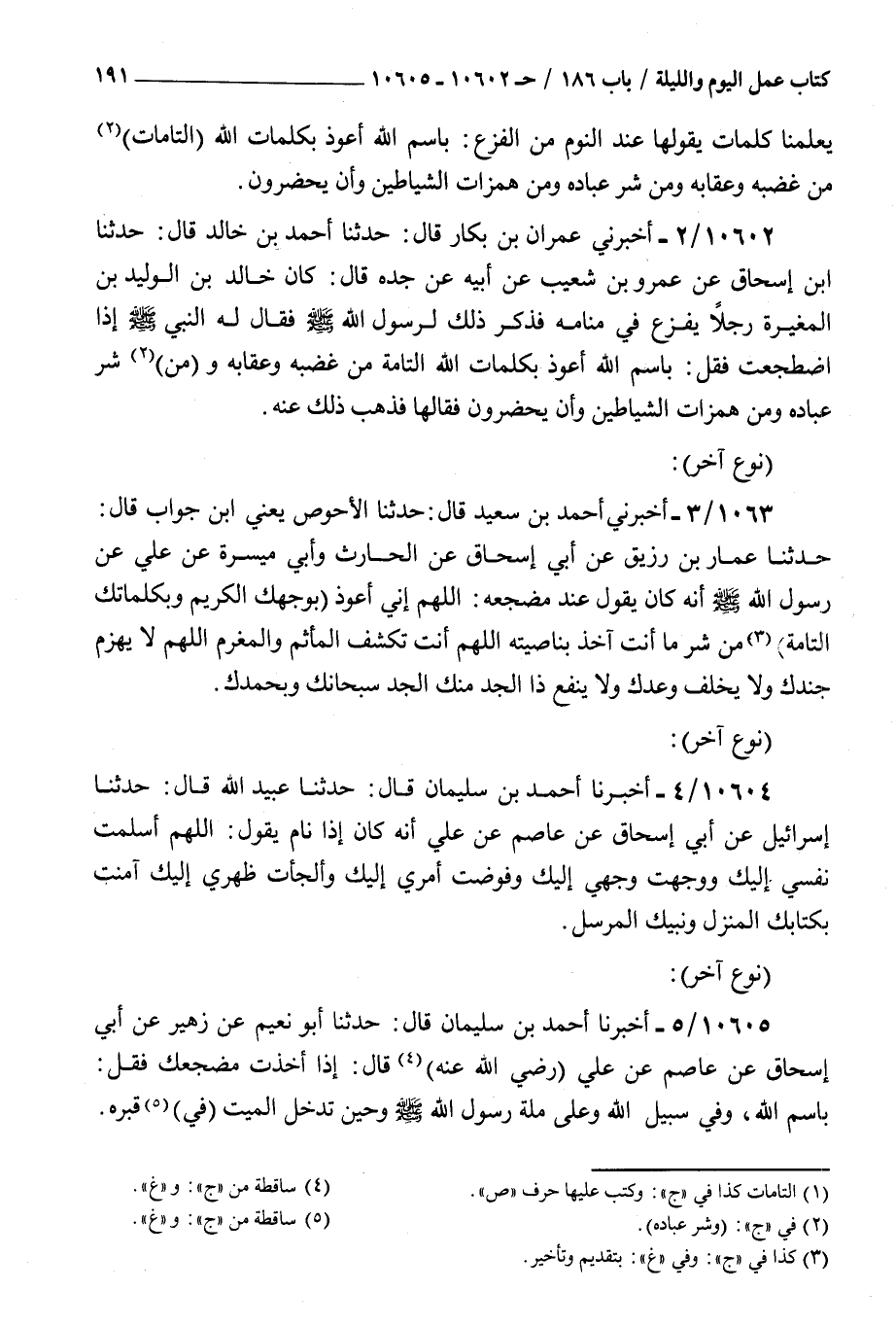10602 - أخبرني عمران بن بكار قال حدثنا أحمد بن خالد قال حدثنا بن إسحاق عن عمرو بن شعيب عن أبيه عن جده قال : كان خالد بن الوليد بن المغيرة رجلا يفزع في منامه فذكر ذلك لرسول الله صلى الله عليه و سلم فقال له النبي صلى الله عليه و سلم إذا اضطجعت فقل باسم الله أعوذ بكلمات الله التامة من عضبه وعقابه ومن شر عباده ومن همزات الشياطين وأن يحضرون فقالها فذهب ذلك عنه نوع آخر