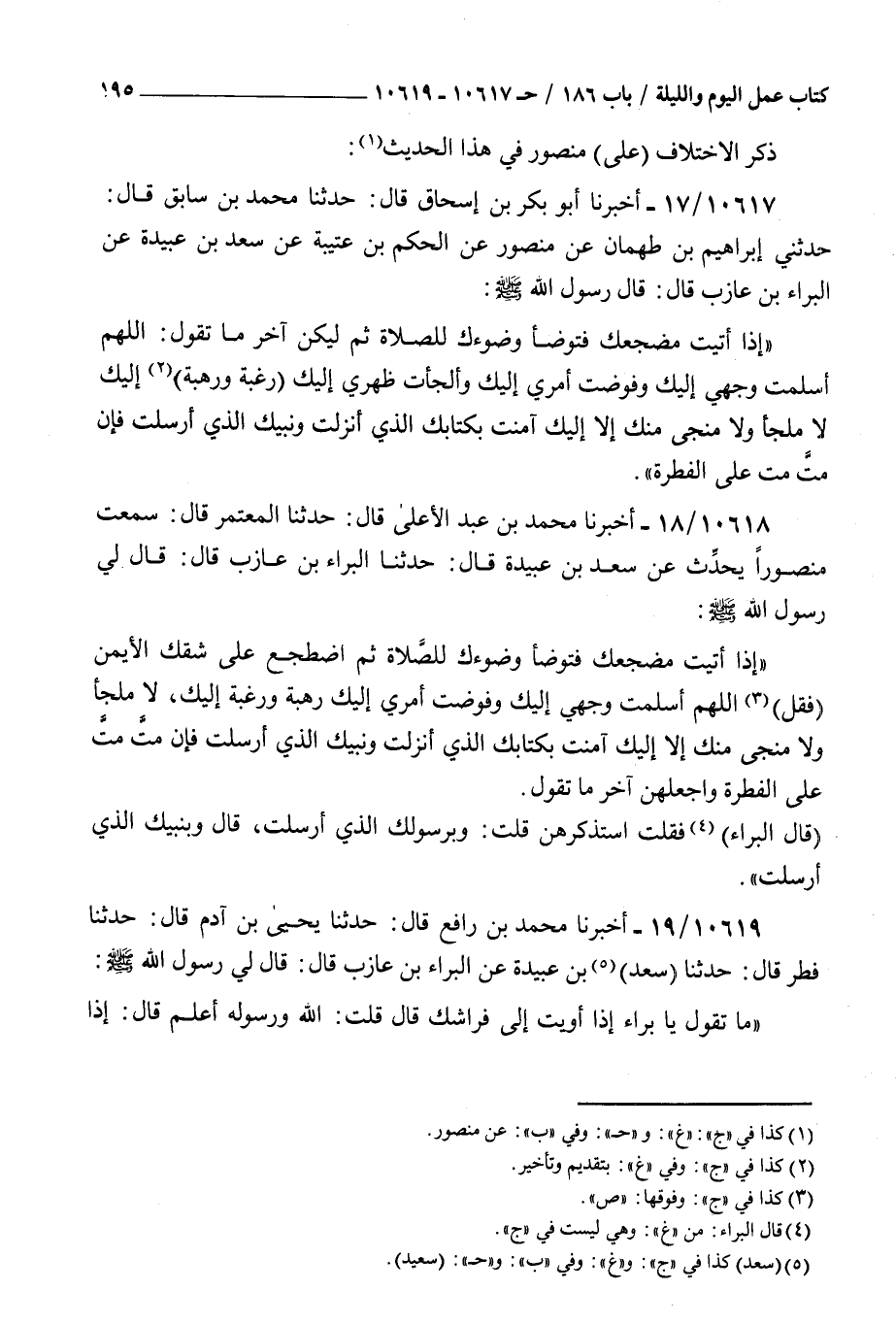 10618 - أخبرنا محمد بن عبد الأعلى قال حدثنا المعتمر قال سمعت منصورا يحدث عن سعد بن عبيدة قال حدثنا البراء بن عازب قال قال لي رسول الله صلى الله عليه و سلم : إذا أتيت مضجعك فتوضأ وضوءك للصلاة ثم اضطجع على شقك الأيمن فقل اللهم أسلمت وجهي إليك وفوضت أمري إليك رهبة ورغبة إليك لا ملجأ ولا منجى منك إلا إليك آمنت بكتابك الذي أنزلت ونبيك الذي أرسلت فإن مت مت على الفطرة واجعلهن آخر ما تقول قال البراء فقلت استذكرهن قلت وبرسولك الذي أرسلت قال وبنبيك الذي أرسلت