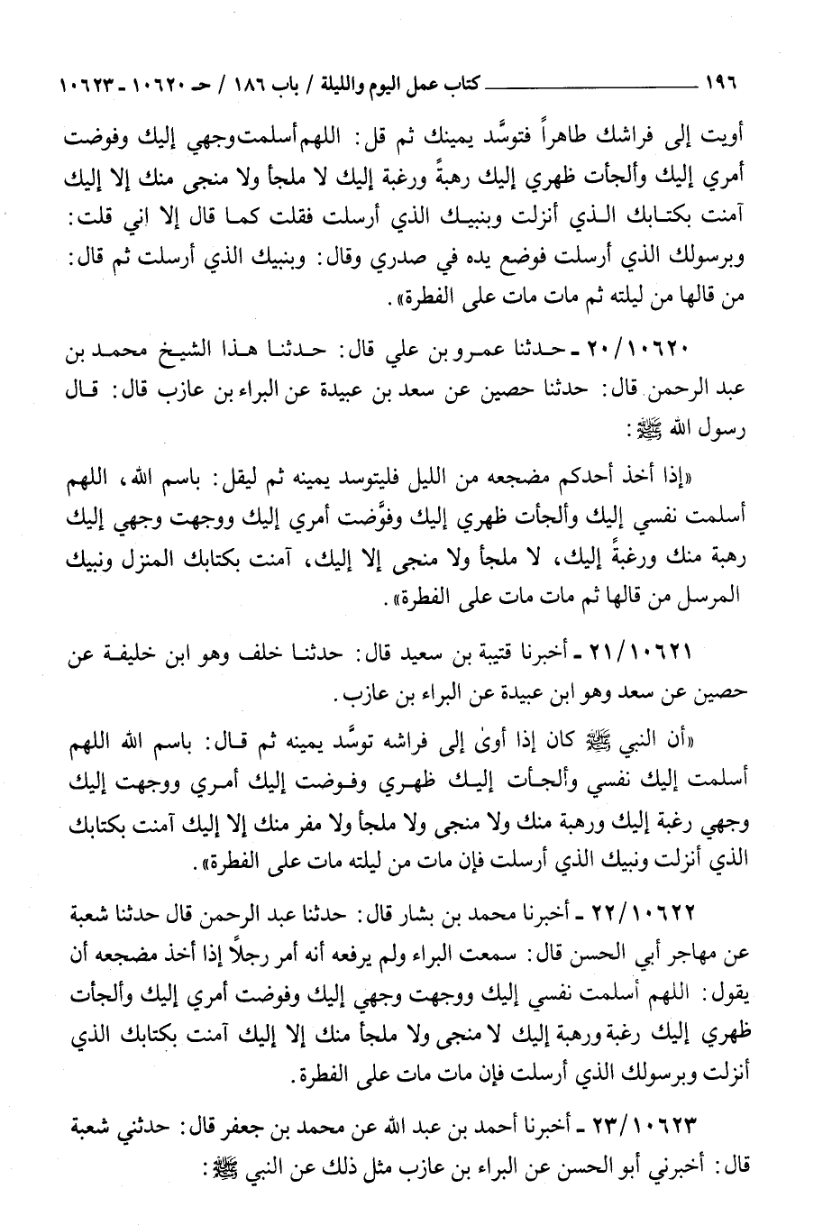 10620 - حدثنا عمرو بن علي قال حدثنا هذا الشيخ محمد بن عبد الرحمن قال حدثنا حصين عن سعد بن عبيدة عن البراء بن عازب قال قال رسول الله صلى الله عليه و سلم : إذا أخذ أحدكم مضجعه من الليل فليتوسد يمينه ثم ليقل باسم الله اللهم أسلمت نفسي إليك وألجأت ظهري إليك وفوضت أمري إليك ووجهت وجهي إليك رهبة منك ورغبة إليك لا ملجأ ولا منجى إلا إليك آمنت بكتابك المنزل ونبيك المرسل من قالها ثم مات مات على الفطرة