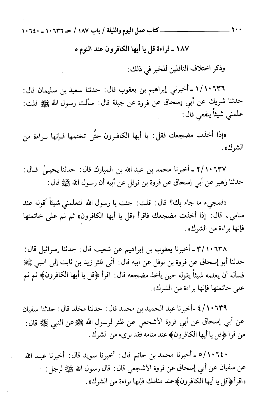 10637 - أخبرنا محمد بن عبد الله بن المبارك قال حدثنا يحيى قال حدثنا زهير عن أبي إسحاق عن فروة بن نوفل عن أبيه أن رسول الله صلى الله عليه و سلم قال : فمجيء ما جاء بك قال قلت جئت يا رسول الله لتعلمني شيئا أقوله عند منامي قال إذا أخذت مضجعك فاقرأ قل يا أيها الكافرون ثم نم على خاتمتها فإنها براءة من الشرك
