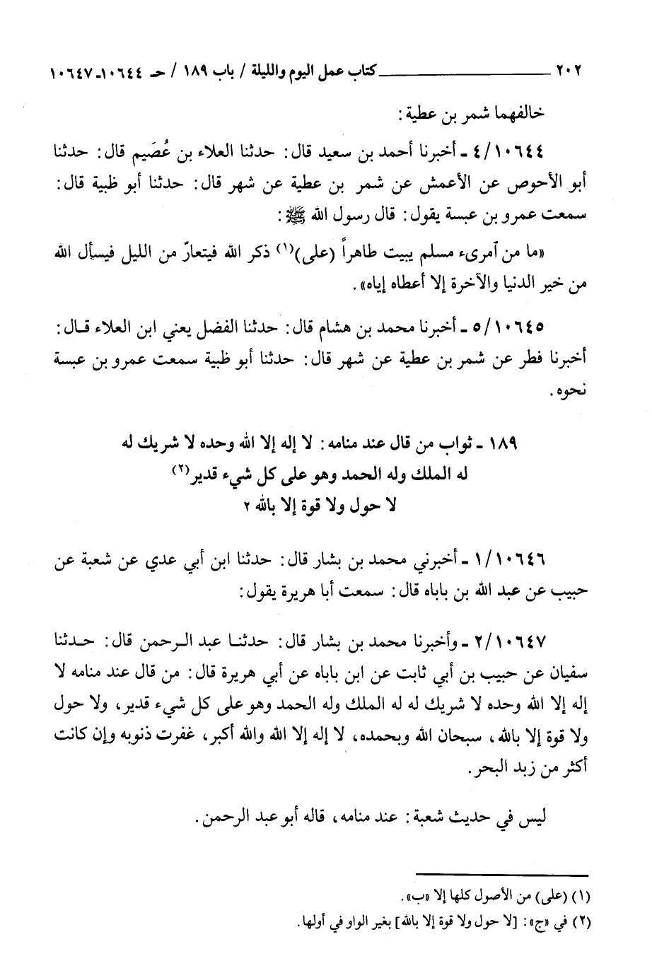 10647 - وأخبرنا محمد بن بشار قال حدثنا عبد الرحمن قال حدثنا سفيان عن حبيب بن أبي ثابت عن بن باباه عن أبي هريرة قال : من قال عند منامه لا إله إلا الله وحده لا شريك له له الملك وله الحمد وهو على كل شيء قدير ولا حول ولا قوة إلا بالله سبحان الله وبحمده لا إله إلا الله والله أكبر غفرت ذنوبه وإن كانت أكثر من زبد البحر ليس في حديث شعبة عند منامه قاله أبو عبد الرحمن