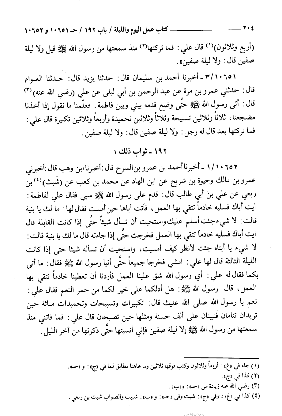 10652 - أخبرنا أحمد بن عمرو بن السرح قال أخبرنا بن وهب قال أخبرني عمرو بن مالك وحيوة بن شريح عن بن الهاد عن محمد بن كعب عن شبث بن ربعي عن علي بن أبي طالب قال : قدم على رسول الله صلى الله عليه و سلم سبي فقال علي لفاطمة ايت أباك فسليه خادما تتقي بها العمل فأتت أباها حين أمست فقال لها ما لك يا بني قالت لا شيء جئت أسلم عليك واستحيت أن تسأل شيئا حتى إذا كانت القابلة قالت ايت أباك فسليه خادما تتقي بها العمل فخرجت حتى إذا جاءته قال ما لك يا بنية قالت لا شيء يا أبتاه جئت لأنظر كيف أمسيت واستحيت أن تسأله شيئا حتى إذا كانت الليلة الثالثة قال لها علي امشي فخرجا جميعا حتى أتيا رسول الله صلى الله عليه و سلم فقال ما أتى بكما فقال له علي أي رسول الله شق علينا العمل فأردنا أن تعطينا خادما نتقي بها العمل قال رسول الله صلى الله عليه و سلم هل أدلكما على خير لكما من حمر النعم فقال علي نعم يا رسول الله صلى الله عليك قال تكبيرات وتسبيحات وتحميدات مائة حين تريدان تنامان فتبيتان على ألف حسنة ومثلها حين تصبحان قال علي فما فاتني منذ سمعتها من رسول الله صلى الله عليه و سلم إلا ليلة صفين فإني أنسيتها حتى ذكرتها من آخر الليل
