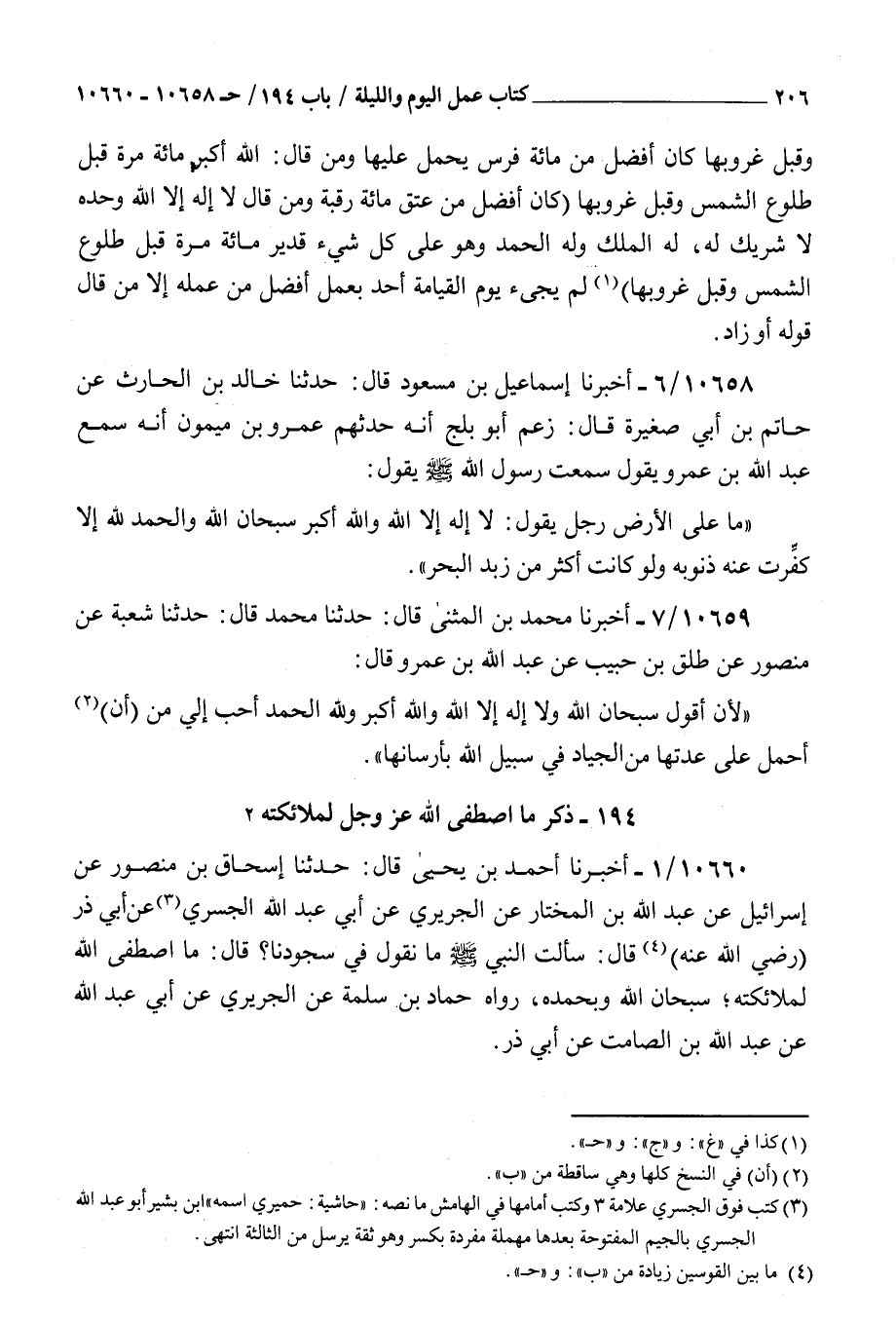 10659 - أخبرنا محمد بن المثنى قال حدثنا محمد قال حدثنا شعبة عن منصور عن طلق بن حبيب عن عبد الله بن عمرو قال : لأن أقول سبحان الله ولا إله إلا الله والله أكبر ولله الحمد أحب إلي من إن أحمل على عدتها من الجياد في سبيل الله بأرسانها