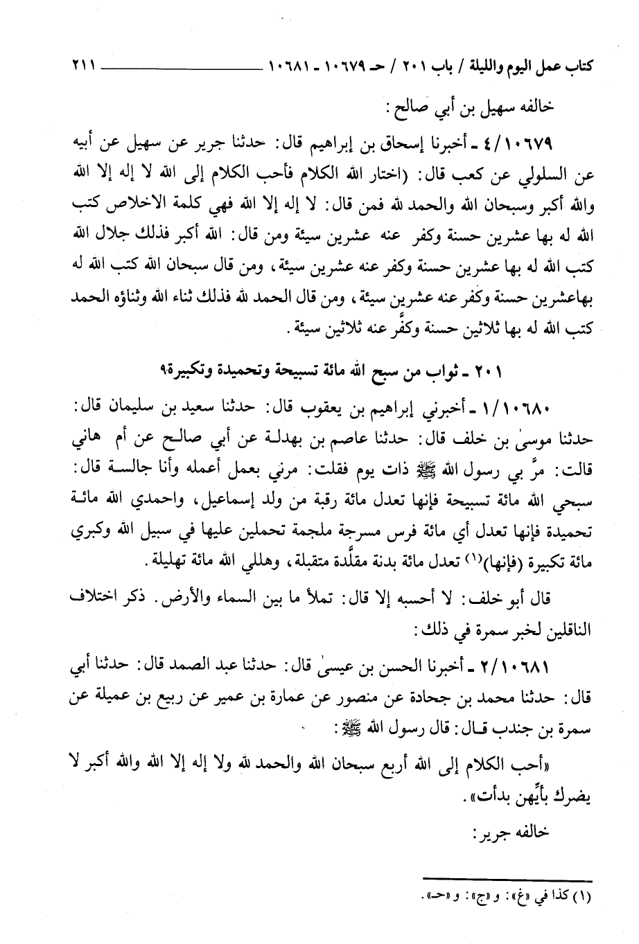 10680 - أخبرني إبراهيم بن يعقوب قال حدثنا سعيد بن سليمان قال حدثنا موسى بن خلف قال حدثنا عاصم بن بهدلة عن أبي صالح عن أم هاني قالت : مر بي رسول الله صلى الله عليه و سلم ذات يوم فقلت مرني بعمل أعمله وأنا جالسة قال سبحي الله مائة تسبيحة فإنها تعدل مائة رقبة من ولد إسماعيل واحمدي الله مائة تحميدة فإنها تعدل أي مائة فرس مسرجة ملجمة تحملين عليها في سبيل الله وكبري مائة تكبيرة فإنها تعدل مائة بدنة مقلدة متقبلة وهللي الله مائة تهليلة قال أبو خلف لا أحسبه إلا قال تملىء ما بين السماء والأرض ذكر اختلاف الناقلين لخبر سمرة في ذلك