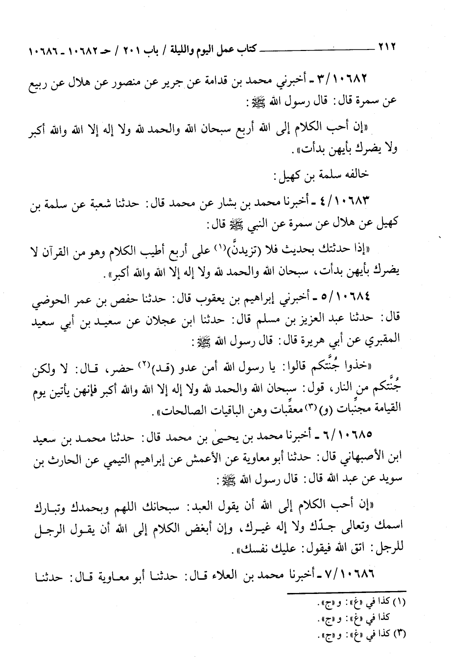 10682 - أخبرني محمد بن قدامة عن جرير عن منصور عن هلال عن ربيع عن سمرة قال قال رسول الله صلى الله عليه و سلم : إن أحب الكلام إلى الله أربع سبحان الله والحمد لله ولا إله إلا الله والله أكبر ولا يضرك بأيهن بدأت خالفه سلمة بن كهيل