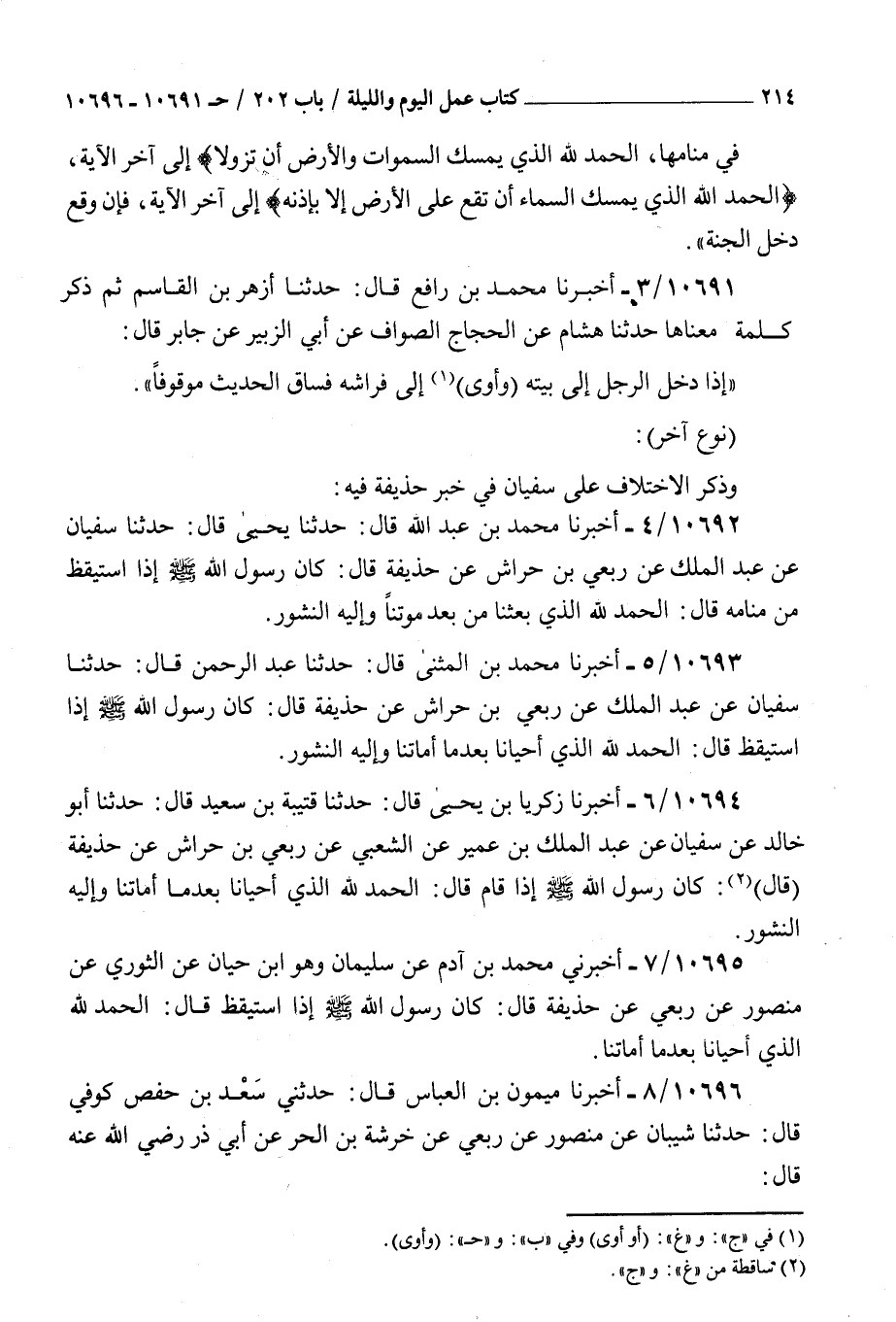 10692 - أخبرنا محمد بن عبد الله قال حدثنا يحيى قال حدثنا سفيان عن عبد الملك عن ربعي بن حراش عن حذيفة قال : كان رسول الله صلى الله عليه و سلم إذا استيقظ من منامه قال الحمد لله الذي بعثنا من بعد موتنا وإليه النشور