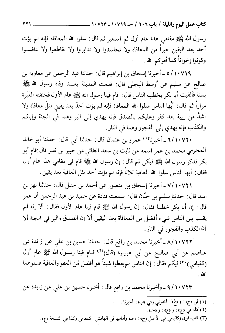 10721 - أخبرنا إسحاق بن منصور عن أحمد بن حنبل قال حدثنا بهز بن أسد قال حدثنا سليم بن حيان قال سمعت قتادة عن حميد بن عبد الرحمن أن عمر قال إن أبا بكر خطبنا فقال : إن رسول الله صلى الله عليه و سلم قام فينا عام الأول فقال إلا أنه لم يقسم بين الناس شيء أفضل من المعافاة بعد اليقين ألا إن الصدق والبر في الجنة إلا إن الكذب والفجور في النار