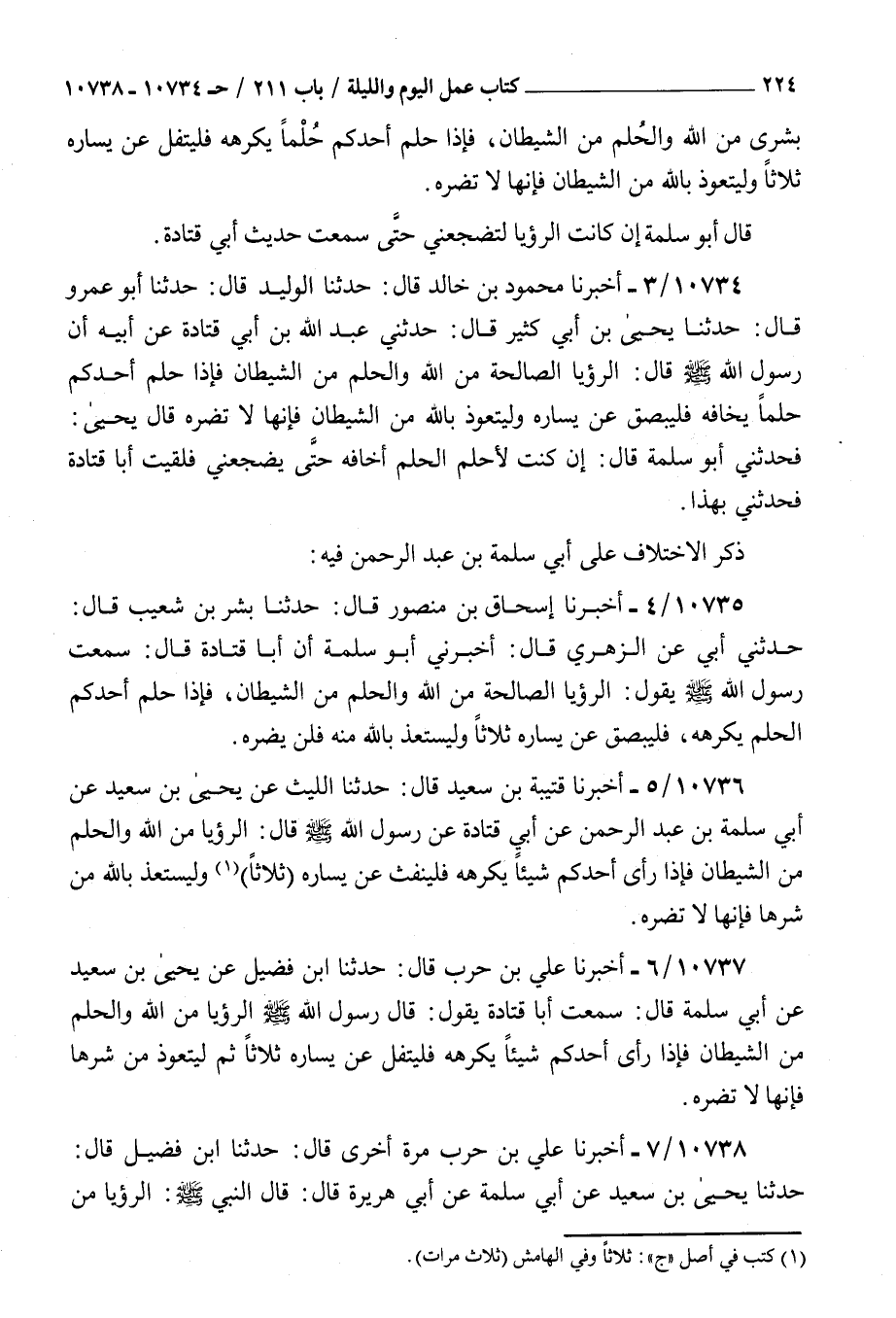 10737 - أخبرنا علي بن حرب قال حدثنا بن فضيل عن يحيى بن سعيد عن أبي سلمة قال سمعت أبا قتادة يقول قال رسول الله صلى الله عليه و سلم : الرؤيا من الله والحلم من الشيطان فإذا رأى أحدكم شيئا يكرهه فليتفل عن يساره ثلاثا ثم ليتعوذ من شرها فإنها لا تضره