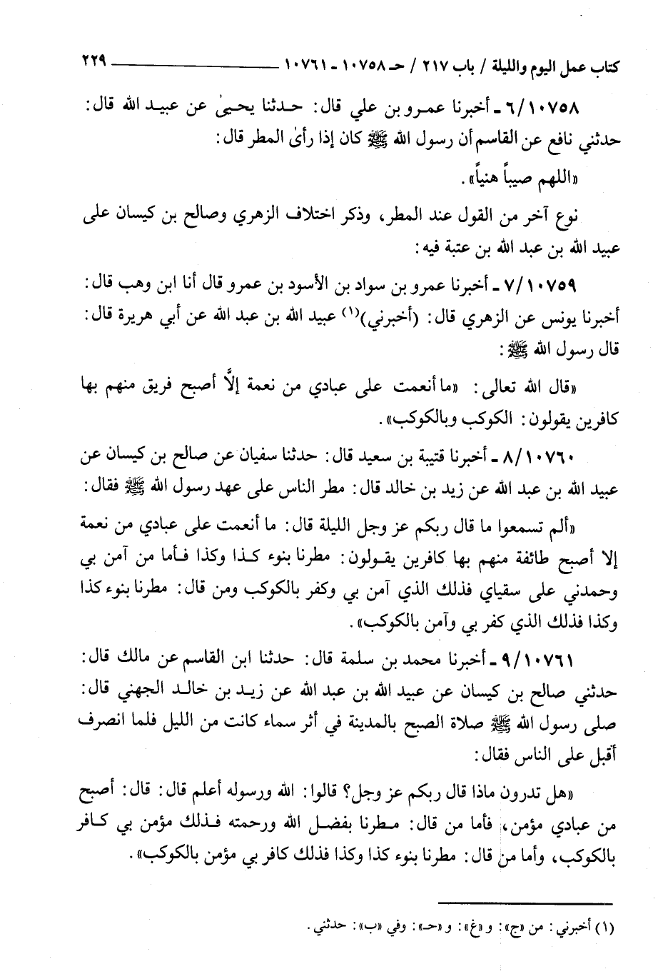 10760 - أخبرنا قتيبة بن سعيد قال حدثنا سفيان عن صالح بن كيسان عن عبيد الله بن عبد الله عن زيد بن خالد قال مطر الناس على عهد رسول الله صلى الله عليه و سلم فقال : ألم تسمعوا ما قال ربكم عز و جل الليلة قال ما أنعمت على عبادي من نعمة إلا أصبح طائفة منهم بها كافرين يقولون مطرنا بنوء كذا وكذا فأما من آمن بي وحمدني على سقياي فذلك الذي آمن بي وكفر بالكوكب ومن قال مطرنا بنوء كذا وكذا فذلك الذي كفر بي وآمن بالكوكب