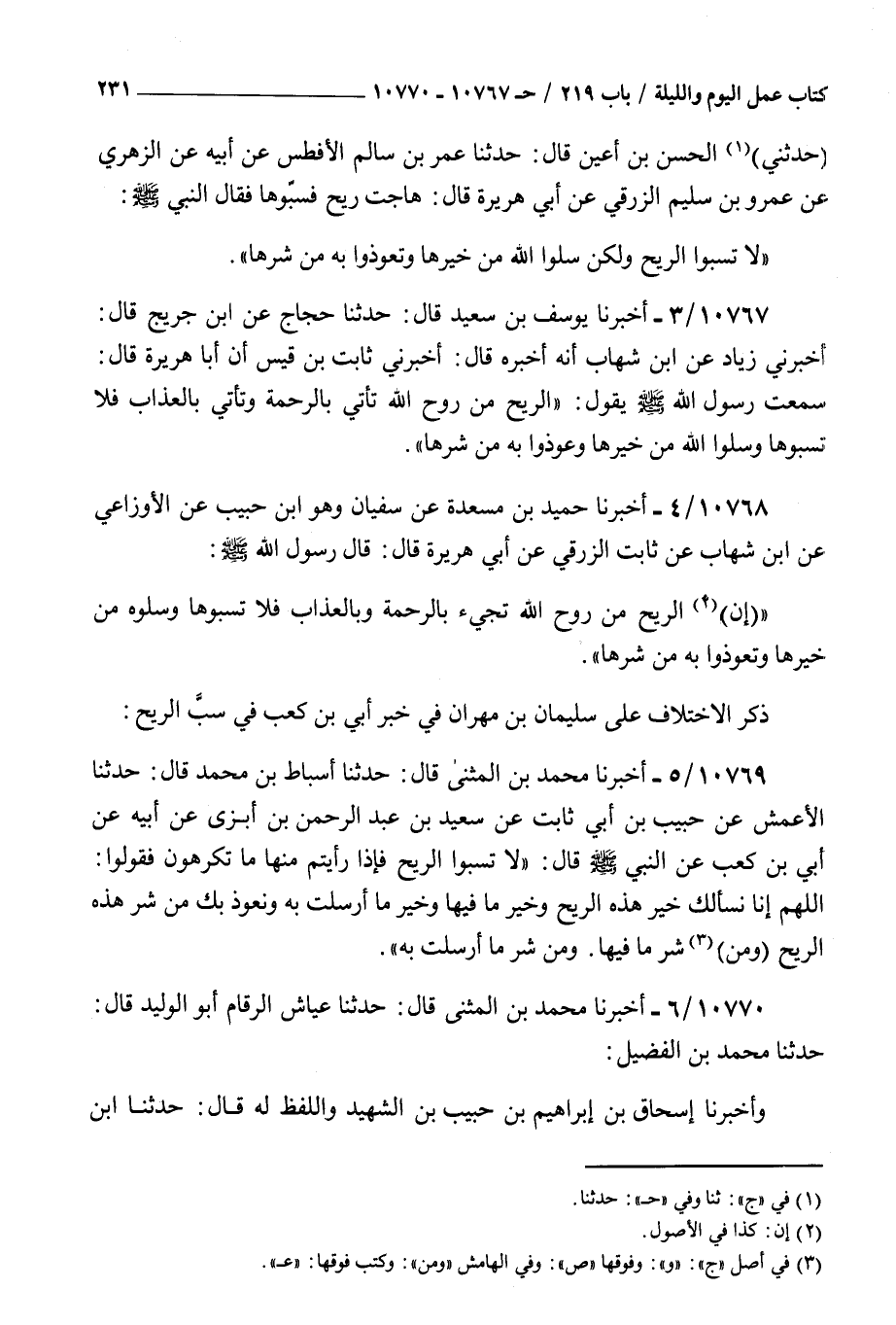 10770 - أخبرنا محمد بن المثنى قال حدثنا عياش الرقام أبو الوليد قال حدثنا محمد بن الفضيل وأخبرنا إسحاق بن إبراهيم بن حبيب بن الشهيد واللفظ له قال حدثنا بن الفضيل قال حدثنا الأعمش عن حبيب عن ذر عن سعيد بن عبد الرحمن بن أبزى عن أبيه عن أبي بن كعب عن النبي صلى الله عليه و سلم قال : لا تسبوا الريح فإذا رأيتم منها ما تكرهون فقولوا اللهم إنا نسألك من خير هذه الريح وخير ما فيها وخير ما أمرت به ونعوذ بك من شر هذه الريح وشر ما فيها وشر ما أمرت به