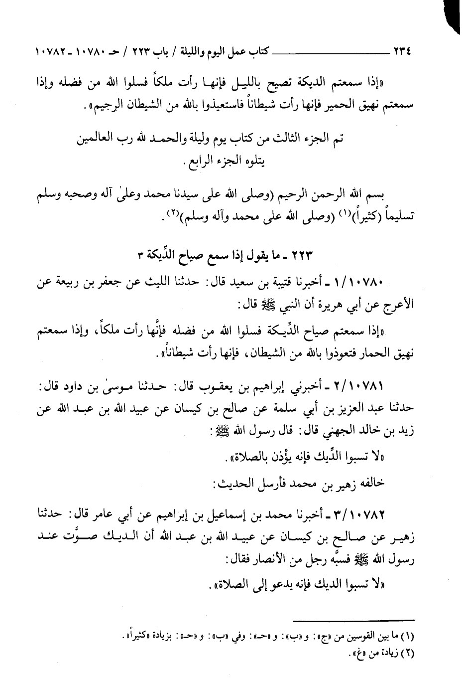 10780 - أخبرنا قتيبة بن سعيد قال حدثنا الليث عن جعفر بن ربيعة عن الأعرج عن أبي هريرة أن النبي صلى الله عليه و سلم قال : إذا سمعتم صياح الديكة فسلوا الله من فضله فإنها رأت ملكا وإذا سمعتم نهيق الحمار فتعوذوا بالله من الشيطان فإنها رأت شيطانا