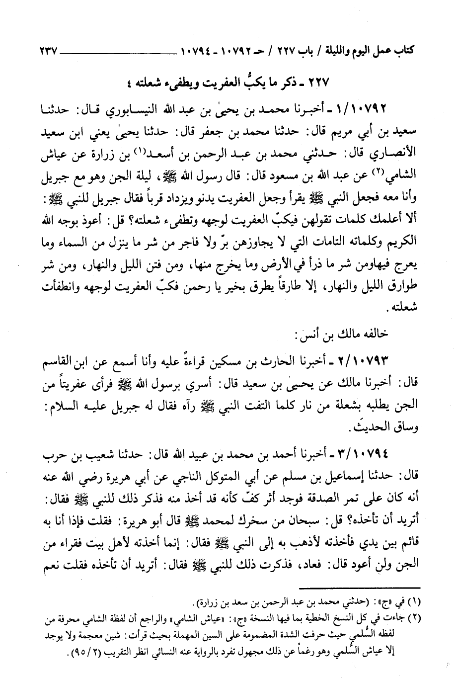 10792 - أخبرنا محمد بن يحيى بن عبد الله النيسابوري قال حدثنا سعيد بن أبي مريم قال حدثنا محمد بن جعفر قال حدثنا يحيى يعني بن سعيد الأنصاري قال حدثني محمد بن عبد الرحمن بن أسعد بن زرارة عن عياش الشامي عن عبد الله بن مسعود قال قال رسول الله صلى الله عليه و سلم ليلة الجن : وهو مع جبريل وأنا معه فجعل النبي صلى الله عليه و سلم يقرأ وجعل العفريت يدنو ويزداد قربا فقال جبريل للنبي صلى الله عليه و سلم ألا أعلمك كلمات تقولهن فيكب العفريت لوجهه وتطفىء شعلته قل أعوذ بوجه الله الكريم وكلماته التامات التي لا يجاوزهن بر ولا فاجر من شر ما ينزل من السماء وما يعرج فيها ومن شر ما ذرأ في الأرض وما يخرج منها ومن فتن الليل والنهار ومن شر طوارق الليل والنهار إلا طارقا يطرق بخير يا رحمن فكب العفريت لوجهه وانطفأت شعلته خالفه مالك بن أنس
