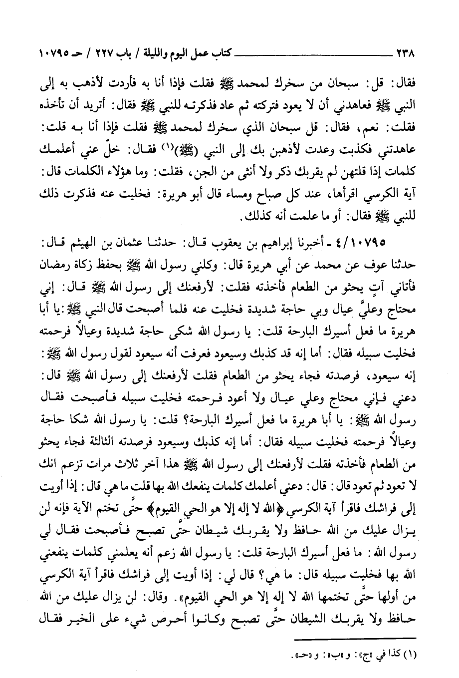 10795 - أخبرنا إبراهيم بن يعقوب قال حدثنا عثمان بن الهيثم قال حدثنا عوف عن محمد عن أبي هريرة قال : وكلني رسول الله صلى الله عليه و سلم بحفظ زكاة رمضان فأتاني آت يحثو من الطعام فأخذته فقلت لأرفعنك إلى رسول الله صلى الله عليه و سلم قال إني محتاج وعلي عيال وبي حاجة شديدة فخليت عنه فلما أصبحت قال النبي صلى الله عليه و سلم يا أبا هريرة ما فعل أسيرك البارحة قلت يا رسول الله شكى حاجة شديدة وعيالا فرحمته فخليت سبيله فقال أما إنه قد كذبك وسيعود فعرفت أنه سيعود لقول رسول الله صلى الله عليه و سلم إنه سيعود فرصدته فجاء يحثو من الطعام فقلت لأرفعنك إلى رسول الله صلى الله عليه و سلم قال دعني فإني محتاج وعلي عيال ولا أعود فرحمته فخليت سبيله فأصبحت فقال رسول الله صلى الله عليه و سلم يا أبا هريرة ما فعل أسيرك البارحة قلت يا رسول الله شكا حاجة وعيالا فرحمته فخليت سبيله فقال أما إنه كذبك وسيعود فرصدته الثالثة فجاء يحثو من الطعام فأخذته فقلت لأرفعنك إلى رسول الله صلى الله عليه و سلم هذا آخر ثلاث مرات تزعم أنك لا تعود ثم تعود قال قال دعني أعلمك كلمات ينفعك الله بها قلت ما هي قال إذا أويت إلى فراشك فاقرأ آية الكرسي الله لا إله إلا هو الحي القيوم حتى تختم الآية فإنه لن يزال عليك من الله حافظ ولا يقربك شيطان حتى تصبح فأصبحت فقال لي رسول الله ما فعل أسيرك البارحة قلت يا رسول الله زعم أنه يعلمني كلمات ينفعني الله بها فخليت سبيله قال ما هي قال لي إذا أويت إلى فراشك فاقرأ آية الكرسي من أولها حتى تختمها الله لا إله إلا هو الحي القيوم وقال لن يزال عليك من الله حافظ ولا يقربك الشيطان حتى تصبح وكانوا أحرص شيء على الخير فقال النبي صلى الله عليه و سلم أما انه كذوب وقد صدقك تعلم من تخاطب منذ ثلاث يا أبا هريرة فقلت لا قال ذلك الشيطان