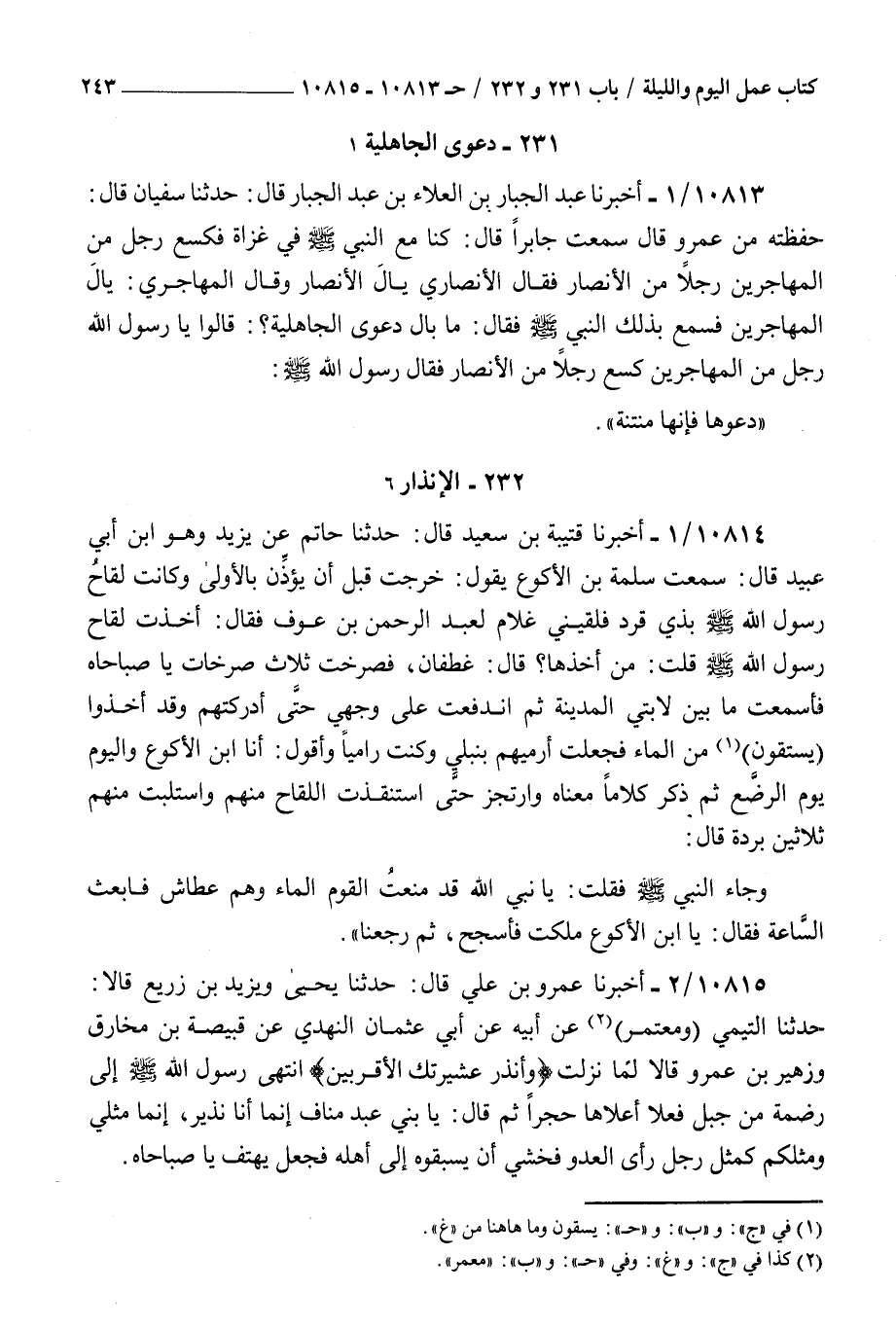 10813 - أخبرنا عبد الحبار بن العلاء بن عبد الجبار قال حدثنا سفيان قال حفظته من عمرو قال سمعت جابرا قال : كنا مع النبي صلى الله عليه و سلم في غزاة فكسع رجل من المهاجرين رجلا من الأنصار فقال الأنصاري يال الأنصار وقال المجاري يال المهاجرين فسمع بذلك النبي صلى الله عليه و سلم فقال ما بال دعوى الجاهلية قالوا يا رسول الله رجل من المهاجرين كسع رجلا من الأنصار فقال رسول الله صلى الله عليه و سلم دعوها فإنها منتنة