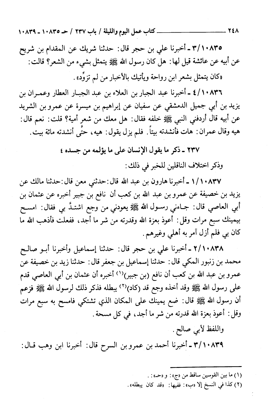 10838 - أخبرنا علي بن حجر قال حدثنا إسماعيل وأخبرنا أبو صالح محمد بن زنبور المكي قال حدثنا إسماعيل بن جعفر قال حدثنا زيد بن خصيفة عن عمرو بن عبد الله بن كعب أن نافع بن جبير أخبره : أن عثمان بن أبي العاصي قدم على رسول الله صلى الله عليه و سلم وقد أخذه وجع قد كاد يبطله فذكر ذلك لرسول الله صلى الله عليه و سلم فزعم أن رسول الله صلى الله عليه و سلم قال ضع يمينك على المكان الذي تشتكي فامسح به سبع مرات وقل أعوذ بعزة الله قدرته من شر ما أجد في كل مسحة واللفظ لأبي صالح