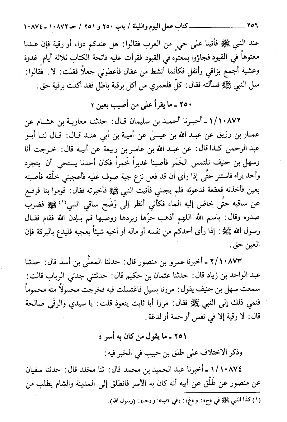 10873 - أخبرنا عمرو بن منصور قال حدثنا المعلى بن أسد قال حدثنا عبد الواحد بن زياد قال حدثنا عثمان بن حكيم قال حدثتني جدتي الرباب قالت سمعت سهل بن حنيف يقول مررنا بسيل فاغتسلت فيه فخرجت محمولا منه محموما فنمي ذلك إلى النبي صلى الله عليه و سلم فقال : مروا أبا ثابت يتعوذ قلت يا سيدي والرقى صالحة قال لا رقية إلا في نفس أو حمة أو لدغة