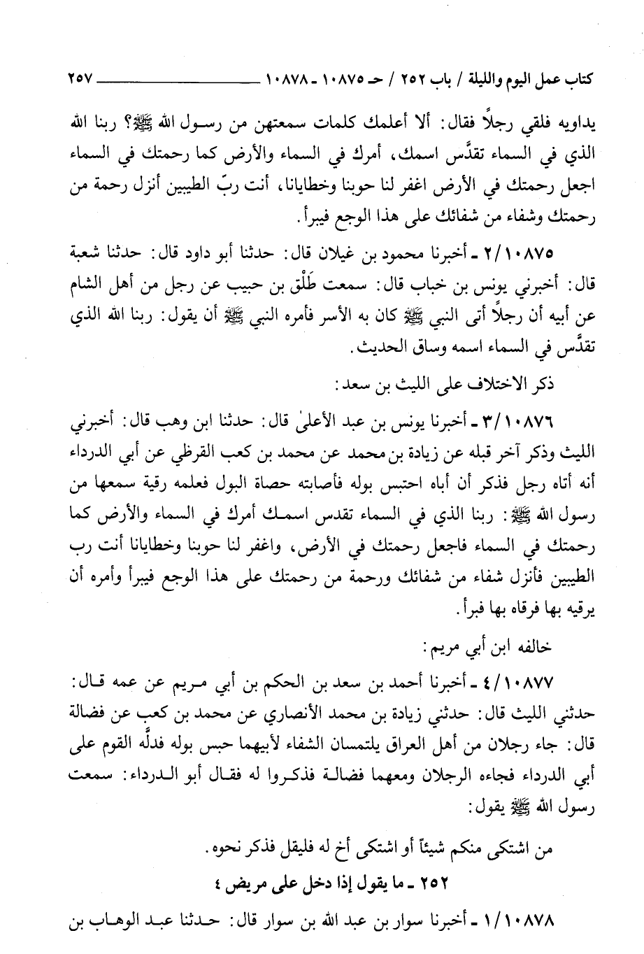 10876 - أخبرنا يونس بن عبد الأعلى قال حدثنا بن وهب قال أخبرني الليث وذكر آخر قبله عن زيادة بن محمد عن محمد بن كعب القرظي عن أبي الدرداء أنه أتاه رجل فذكر : أن أباه احتبس بوله فأصابته حصاة البول فعلمه رقية سمعها من رسول الله صلى الله عليه و سلم ربنا الذي في السماء تقدس اسمك أمرك في السماء والأرض كما رحمتك في السماء فاجعل رحمتك في الأرض واغفر لنا حوبنا وخطايانا أنت رب الطيبين فأنزل شفاء من شفائك ورحمة من رحمتك على هذا الوجع فيبرأ وأمره أن يرقيه بها فرقاه بها فبرأ خالفه بن أبي مريم