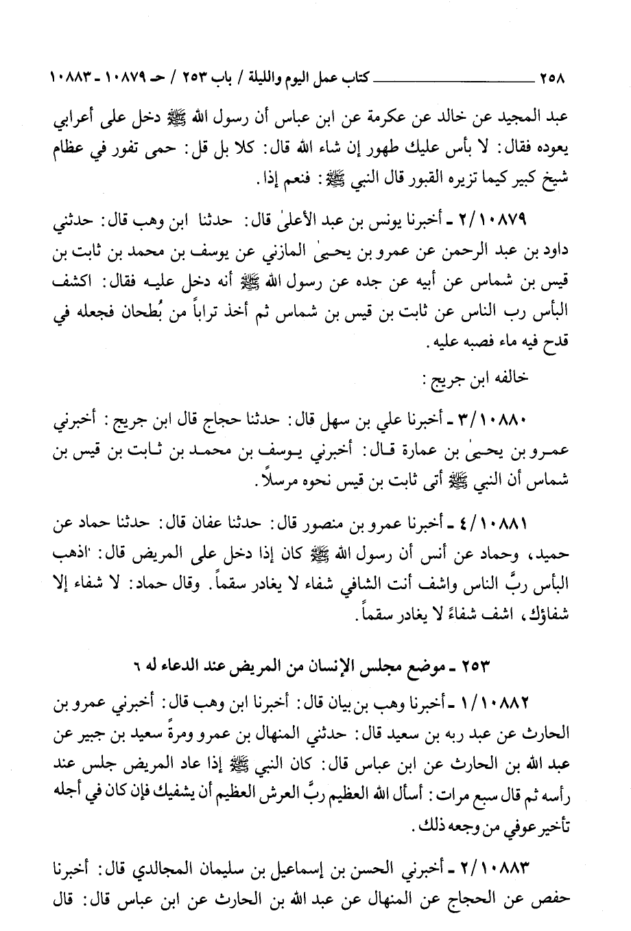 10882 - أخبرنا وهب بن بيان قال أخبرنا بن وهب قال أخبرني عمرو بن الحارث عن عبد ربه بن سعيد قال حدثني المنهال بن عمرو ومرة سعيد بن جبير عن عبد الله بن الحارث عن بن عباس قال : كان النبي صلى الله عليه و سلم إذا عاد المريض جلس عند رأسه ثم قال سبع مرات أسأل الله العظيم رب العرش العظيم أن يشفيك فإن كان في أجله تأخير عوفي من وجعه ذلك