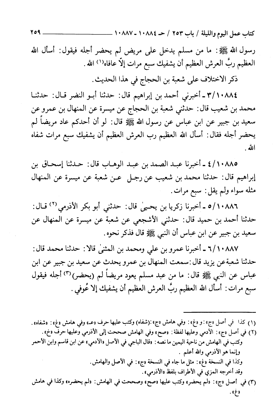 10887 - أخبرنا عمرو بن علي ومحمد بن المثنى قالا حدثنا محمد قال حدثنا شعبة عن يزيد قال سمعت المنهال بن عمرو يحدث عن سعيد بن جبير عن بن عباس عن النبي صلى الله عليه و سلم قال : ما من عبد مسلم يعود مريضا لم يحضر أجله فيقول سبع مرات أسأل الله العظيم رب العرش العظيم أن يشفيك إلا عوفي