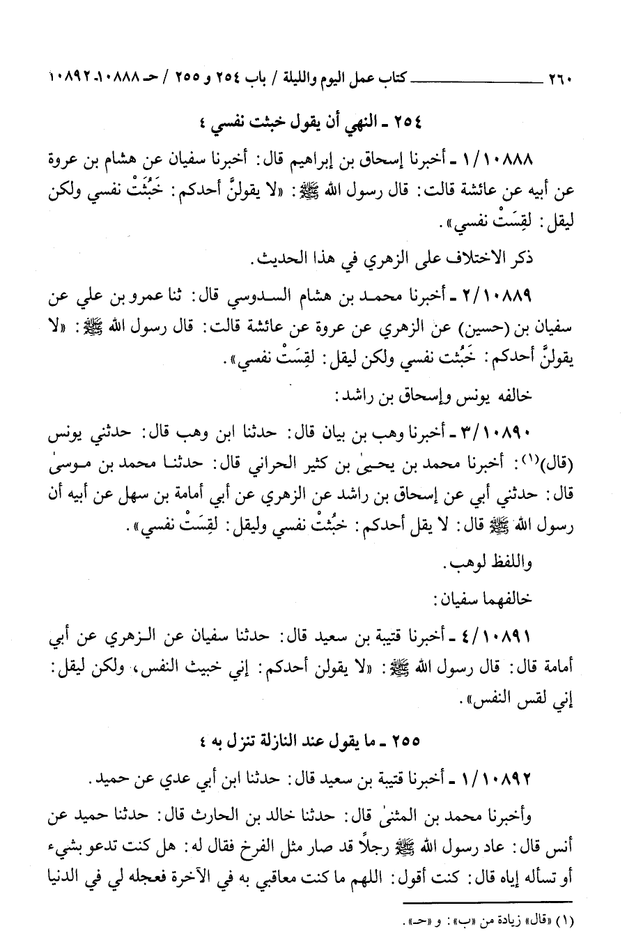 10891 - أخبرنا قتيبة بن سعيد قال حدثنا سفيان عن الزهري عن أبي أمامة قال قال رسول الله صلى الله عليه و سلم : لا يقولن أحدكم إني خبيث النفس ولكن ليقل إني لقس النفس