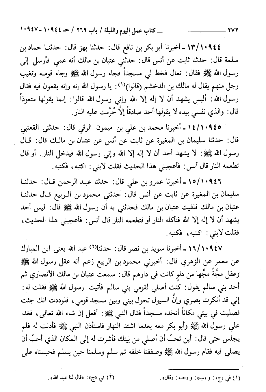 10945 - أخبرنا محمد بن علي بن ميمون الرقي قال حدثني القعنبي قال حدثنا سليمان بن المغيرة عن ثابت عن أنس عن عتبان بن مالك قال قال رسول الله صلى الله عليه و سلم : لا يشهد أحد أن لا إله إلا الله وإني رسول الله فيدخل النار أو قال تطعمه النار قال أنس فأعجبني هذا الحديث فقلت لابني اكتبه فكتبه
