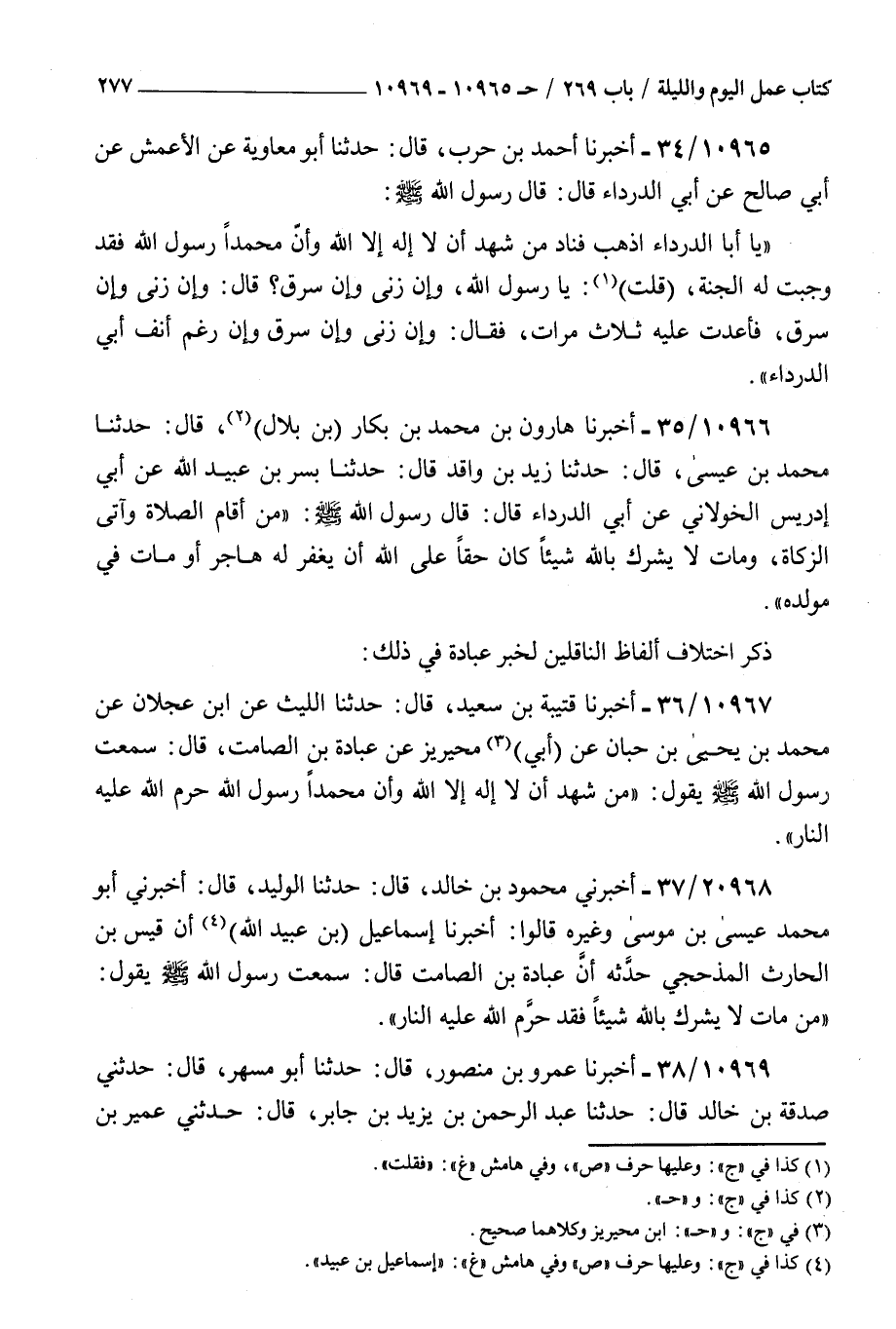 10966 - أخبرنا هارون بن محمد بن بكار بن بلال قال حدثنا محمد بن عيسى قال حدثنا زيد بن واقد قال حدثنا بسر بن عبيد الله عن أبي إدريس الخولاني عن أبي الدرداء قال قال رسول الله صلى الله عليه و سلم : من أقام الصلاة وآتى الزكاة ومات لا يشرك بالله شيئا كان حقا على الله أن يغفر له هاجر أو مات في مولده ذكر اختلاف ألفاظ الناقلين لخبر عبادة في ذلك