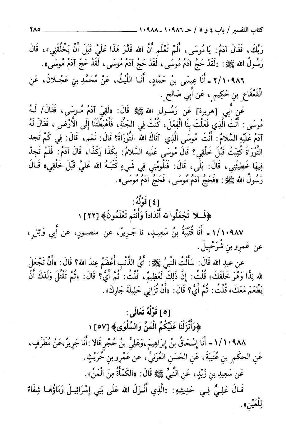 10986 - أنا عيسى بن حماد أنا الليث عن محمد بن عجلان عن القعقاع بن حكيم عن أبي صالح عن أبي هريرة عن رسول الله صلى الله عليه و سلم قال : لقي آدم موسى فقال له موسى أنت الذي فعلت بنا الفعل كنت في الجنة فأهبطتنا إلى الأرض فقال له آدم عليه السلام أنت موسى الذي آتاك الله التوراة قال نعم قال في كم تجد التوراة كتبت قبل خلقي قال موسى عليه السلام بكذا وكذا قال آدم فلم تجد فيها خطيئتي قال بلى قال فتلومني في شيء كتبه الله علي قبل خلقي قال رسول الله صلى الله عليه و سلم فحج آدم موسى فحج آدم موسى