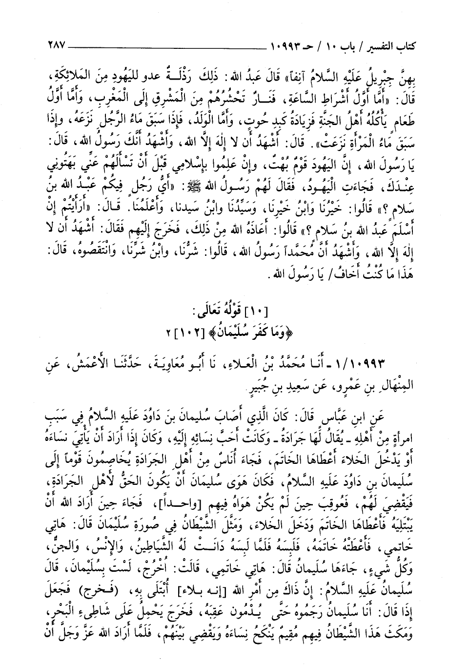 10993 - أنا محمد بن العلاء أنا أبو معاوية حدثنا الأعمش عن المنهال بن عمرو عن سعيد بن جبير عن بن عباس قال : كان الذي أصاب سليمان بن داود عليه السلام في سبب امرأة من أهله يقال لها جرادة وكانت أحب نسائه إليه وكان إذا أراد أن يأتي نساءه أو يدخل الخلاء أعطاها الخاتم فجاء أناس من أهل الجرادة يخاصمون قوما إلى سليمان بن داود عليه السلام فكان هوى سليمان أن يكون الحق لأهل الجرادة فيقضي لهم فعوقب حين لم يكن هواه فيهم واحدا فجاء حين أراد الله أن يبتليه فأعطاها الخاتم ودخل الخلاء ومثل الشيطان في صورة سليمان قال هاتي خاتمي فأعطته خاتمه فلبسه فلما لبسه دانت له الشياطين والإنس والجن وكل شيء جاءها سليمان قال هاتي خاتمي قالت اخرج لست بسليمان قال سليمان عليه السلام إن ذاك من أمر الله إنه بلاء أبتلى به فخرج فجعل إذا قال أنا سليمان رجموه حتى يدمون عقبه فخرج يحمل على شاطئ البحر ومكث هذا الشيطان فيهم مقيم ينكح نساءه ويقضي بينهم فلما أراد الله عز و جل أن يرد على سليمان ملكه انطلقت الشياطين وكتبوا كتبا فيها سحر وفيها كفر فدفنوها تحت كرسي سليمان عليه السلام ثم أثاروها وقالوا هذا كان يفتن الجن والإنس قال فأكفر الناس سليمان حتى بعث الله محمدا صلى الله عليه و سلم فأنزل الله عز و جل على محمد عليه السلام وما كفر سليمان ولكن الشياطين كفروا يقول الذي صنعوا فخرج سليمان يحمل على شاطئ البحر قال ولما أنكر الناس لما أراد الله أن يرد على سليمان ملكه أنكروا انطلقت الشياطين جاؤوا إلى نسائه فسألوهن فقلن إنه ليأتينا ونحن حيض وما كان يأتينا قبل ذلك فلما رأى الشيطان أنه حضر هلاكه هرب وأرسل به فألقاه في البحر وفي الحديث فتلقاه سمكه فأخذه وخرج الشيطان حتى لحق بجزيرة في البحر وخرج سليمان عليه السلام يحمل لرجل سمكا قال بكم تحمل قال بسمكة من هذا السمك فحمل معه حتى بلغ به أعطاه السمكة التي في بطنها الخاتم فلما أعطاه السمكة شق بطنها يريد يشويها فإذا الخاتم فلبسه فأقبل إليه الإنس والشياطين فأرسل في طلب الشيطان فجعلوا لا يطيقونه فقال احتالوا له فذهبوا فوجدوه نائما قد سكر فبنوا عليه بيتا من رصاص ثم جاؤوا ليأخذوه فوثب فجعل لا يثب في ناحية إلا أماط الرصاص معه فأخذوه فجاؤوا به إلى سليمان فأمر بحنت من رخام فنقر ثم أدخله في جوفه ثم سده بالنحاس ثم أمر به فطرح في البحر