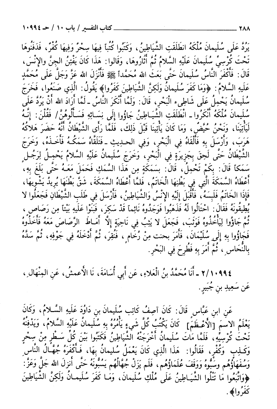 10994 - أنا محمد بن العلاء عن أبي أسامة نا الأعمش عن المنهال عن سعيد بن جبير عن بن عباس قال : كان آصف كاتب سليمان بن داود عليه السلام وكان يعلم الاسم الأعظم كان يكتب كل شيء يأمره به سليمان عليه السلام ويدفنه تحت كرسيه فلما مات سليمان أخرجته الشياطين فكتبوا بين كل سطر من سحر وكذب وكفر فقالوا هذا الذي كان يعمل سليمان بها فأكفره جهال الناس وسفهاؤهم وسبوه ووقف علماؤهم فلم يزل جهالهم يسبونه حتى أنزل الله جل وعز واتبعوا ما تتلوا الشياطين على ملك سليمان وما كفر سليمان ولكن الشياطين كفروا