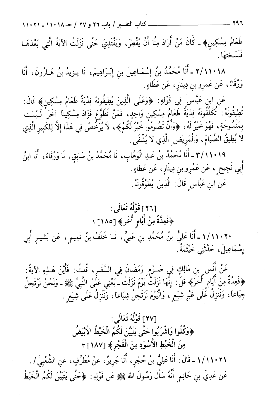 11018 - أنا محمد بن إسماعيل بن إبراهيم نا يزيد بن هارون أنا ورقاء عن عمرو بن دينار عن عطاء عن بن عباس : في قوله وعلى الذين يطيقونه فدية طعام مسكين قال تطيقونه تكلفونه فدية طعام مسكين واحد فمن تطوع فزاد مسكينا آخر ليست بمنسوخة فهو خير له وأن تصوموا خيرا لكم لا يرخص في هذا إلا للكبير الذي لا يطيق الصيام والمريض الذي لا يشفى