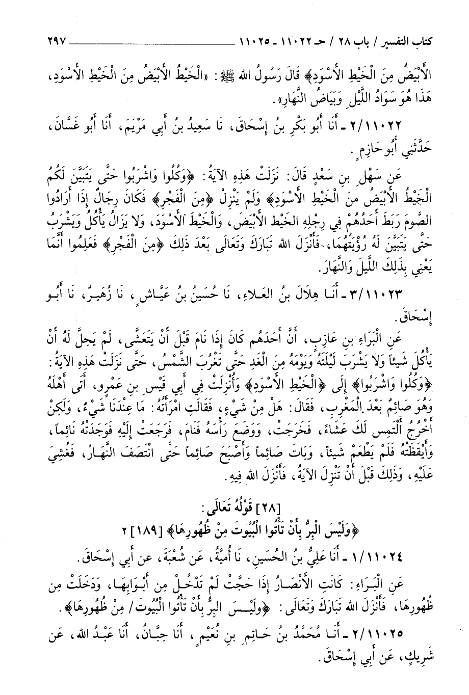 11024 - أنا علي بن الحسين نا أمية عن شعبة عن أبي إسحاق عن البراء : كانت الأنصار إذا حجت لم تدخل من أبوابها ودخلت من ظهورها فأنزل الله تبارك وتعالى { وليس البر بأن تأتوا البيوت من ظهورها }