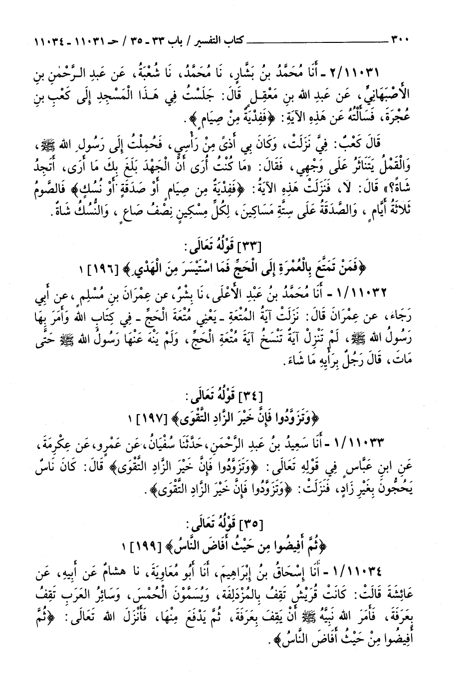11031 - أنا محمد بن بشار نا محمد نا شعبة عن عبد الرحمن بن الأصبهاني عن عبد الله بن معقل قال : جلست في هذا المسجد إلى كعب بن عجرة فسألته عن هذه الآية { ففدية من صيام } قال كعب في نزلت وكان بي أذى من رأسي فحملت إلى رسول الله صلى الله عليه و سلم والقمل يتناثر على وجهي فقال ما كنت أرى أن الجهد بلغ بك ما أرى أتجد شاة قال لا فنزلت هذه الآية { ففدية من صيام } أو صدقة أو نسك فالصوم ثلاثة أيام والصدقة على ستة مساكين لكل مسكين نصف صاع والنسك شاة