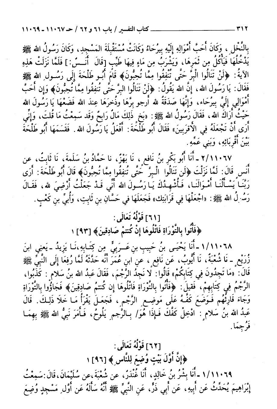 11067 - أنا أبو بكر بن نافع نا بهز نا حماد بن سلمة نا ثابت عن أنس قال : لما نزلت { لن تنالوا البر حتى تنفقوا } البر مما تحبون قال أبو طلحة أرى ربنا يسألنا أموالنا فأشهدك يا رسول الله أني قد جعلت أرضي لله فقال رسول الله صلى الله عليه و سلم اجعلها في قرابتك فجعلها في حسان بن ثابت وأبي بن كعب