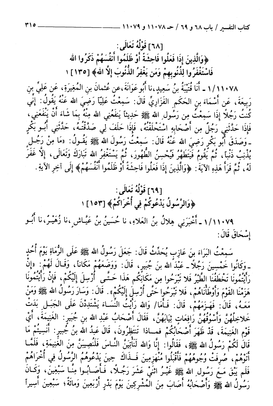 11079 - أخبرني هلال بن العلاء نا حسين بن عياش نا زهير نا أبو إسحاق قال سمعت البراء بن عازب يحدث قال : جعل رسول الله صلى الله عليه و سلم على الرماة يوم أحد وكان خمسين رجلا عبد الله بن جبير قال ووضعهم مكانا وقال لهم إن رأيتمونا تخطفنا الطير فلا تبرحوا من مكانكم هذا حتى أرسل إليكم فإن رأيتمونا هزمنا القوم وأوطأناهم فلا تبرحوا حتى أرسل إليكم قال وسار رسول الله صلى الله عليه و سلم ومن معه قال فهزمهم قال فأما والله رأيت النساء يشتددن على الجبل بدت خلاخلهن وأسوقهن رافعات ثيابهن فقال أصحاب عبد الله بن جبير الغنيمة أي قوم الغنيمة قد ظهر أصحابكم فماذا تنتظرون قال عبد الله بن جبير أنسيتم ما قال لكم رسول الله صلى الله عليه و سلم فقالوا إنا والله لنأتين الناس فلنصيبن من الغنيمة فلما أتوهم صرفت وجوههم فأقبلوا منهزمين فذاك حين يدعوهم الرسول في أخراهم فلم يبق مع رسول الله صلى الله عليه و سلم غير اثنى عشر رجلا فأصابوا منا سبعين وكان رسول الله صلى الله عليه و سلم وأصحابه أصاب من المشركين يوم بدر أربعين ومائة سبعين أسيرا وسبعين قتيلا فقال أبو سفيان أفي القوم محمد أفي القوم محمد فنهاهم رسول الله صلى الله عليه و سلم أن يجيبوه ثم قال أفي القوم بن أبي قحافة ثلاث مرات قال أفي القوم بن الخطاب ثلاث مرات ثم رجع إلى أصحابه فقال أما هؤلاء فقد قتلوا فما ملك عمر نفسه فقال كذبت يا عدو الله إن الذي عددت لأحياء كلهم وقد بقي لك ما يسوؤك فقال يوم بيوم بدر والحروب سجال إنكم سترون في القوم مثلة لم آمر بها ولم تسوؤني ثم أخذ يرتجز أعل هبل فقال رسول الله صلى الله عليه و سلم ألا تجيبوه فقالوا يا رسول الله ما نقول قال قولوا الله أعلى وأجل قال إنا لنا عزا ولا عزا لكم فقال رسول الله صلى الله عليه و سلم ألا تجيبوه قالوا يا رسول الله ما نقول قال قولوا الله مولانا ولا مولى لكم