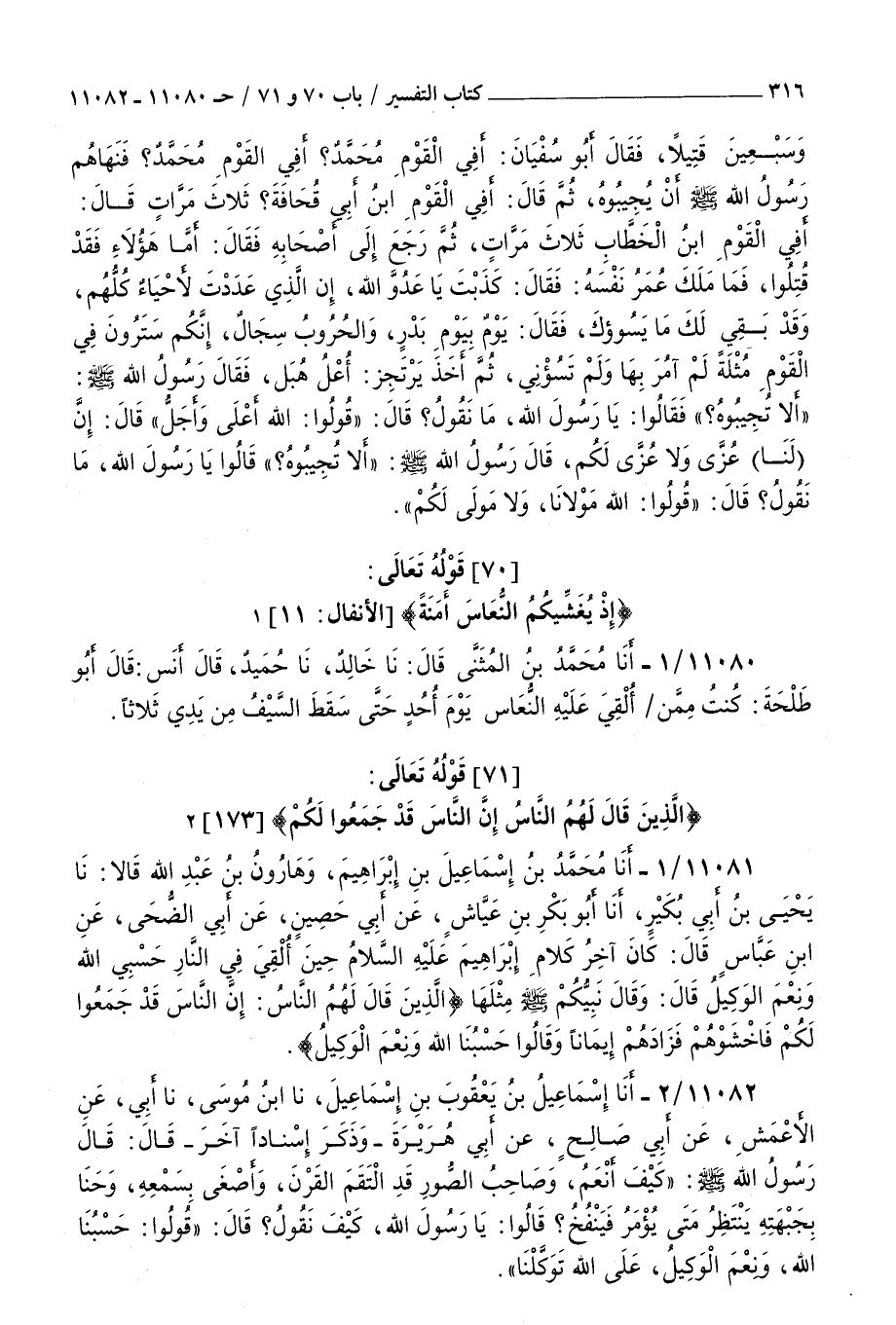 11081 - أنا محمد بن إسماعيل بن إبراهيم وهارون بن عبد الله قالا نا يحيى بن أبي بكير أنا أبو بكر بن عياش عن أبي حصين عن أبي الضحى عن بن عباس قال : كان آخر كلام إبراهيم عليه السلام حين ألقي في النار حسبي الله ونعم الوكيل قال وقال نبيكم صلى الله عليه و سلم مثلها { الذين قال لهم الناس إن الناس قد جمعوا لكم فاخشوهم فزادهم إيمانا وقالوا حسبنا الله ونعم الوكيل }