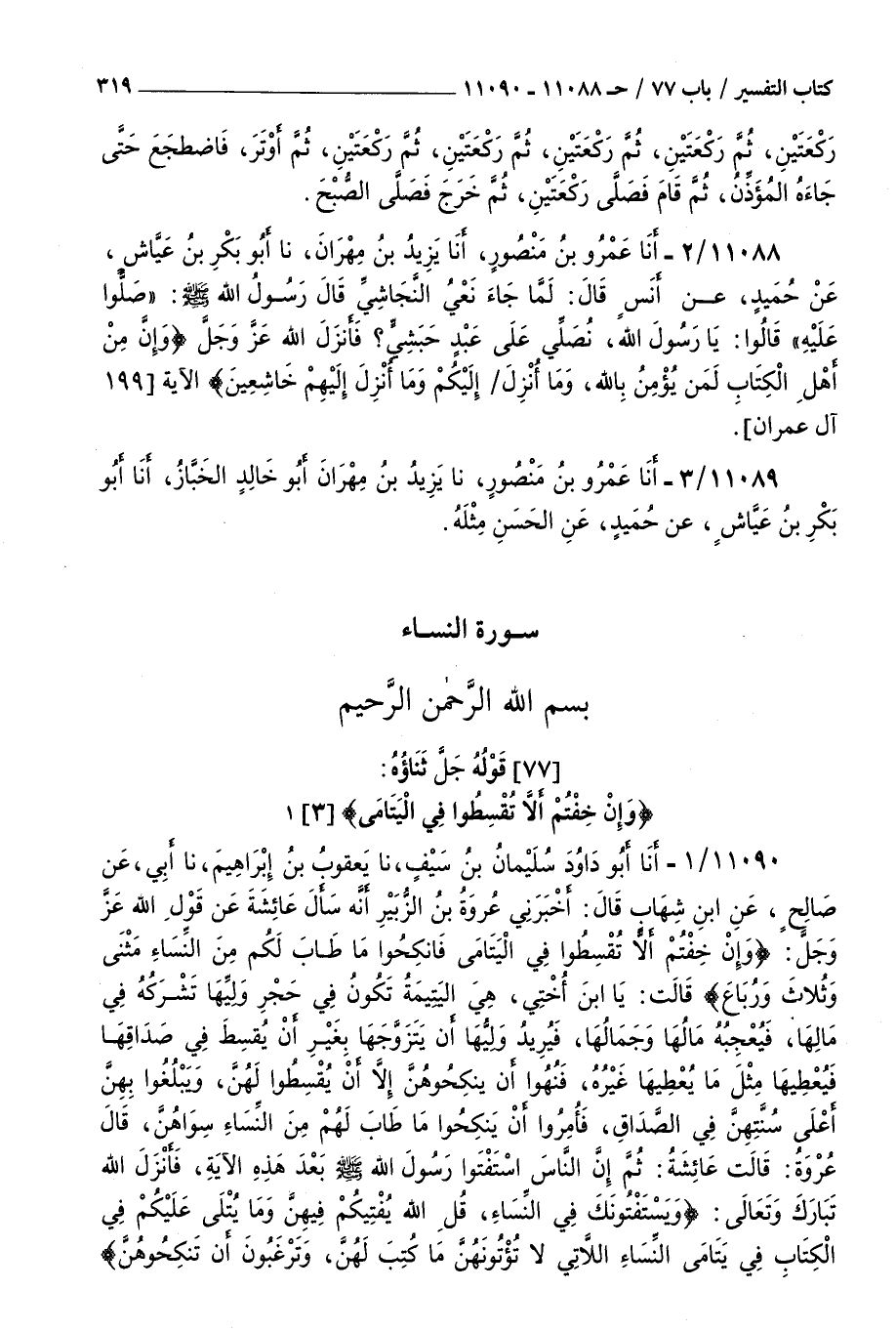 11088 - أنا عمرو بن منصور أنا يزيد بن مهران نا أبو بكر بن عياش عن حميد عن أنس قال لما جاء نعي النجاشي قال رسول الله صلى الله عليه و سلم : صلوا عليه قالوا يا رسول الله نصلي على عبد حبشي فأنزل الله عز و جل { وإن من أهل الكتاب لمن يؤمن بالله وما أنزل إليكم وما أنزل إليهم خاشعين } الآية