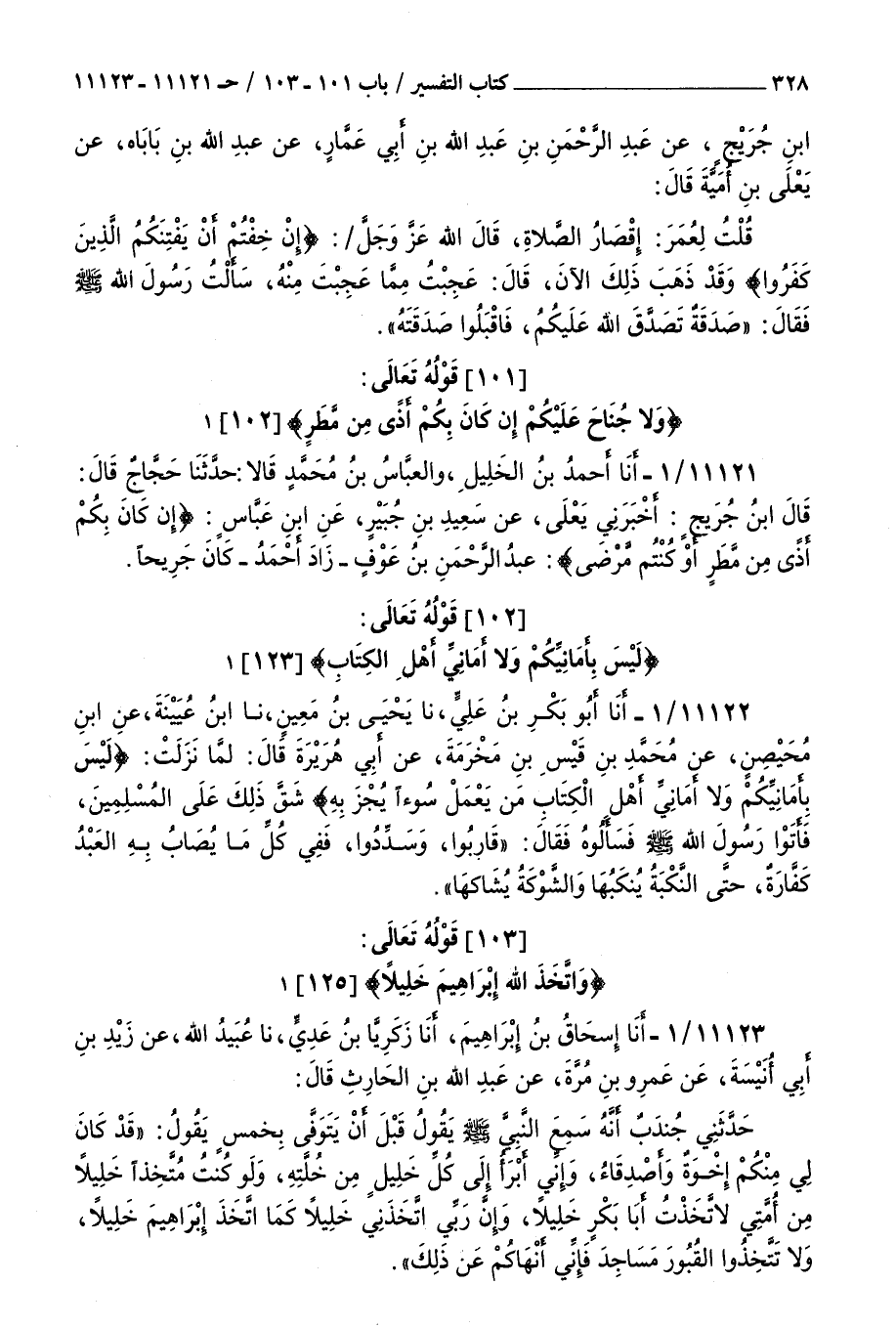 11121 - أنا أحمد بن الخليل والعباس بن محمد قالا حدثنا حجاج قال بن جريج أخبرني يعلى عن سعيد بن جبير عن بن عباس : إن كان بكم أذى من مطر أو كنتم مرضى عبد الرحمن بن عوف زاد أحمد كان جريحا