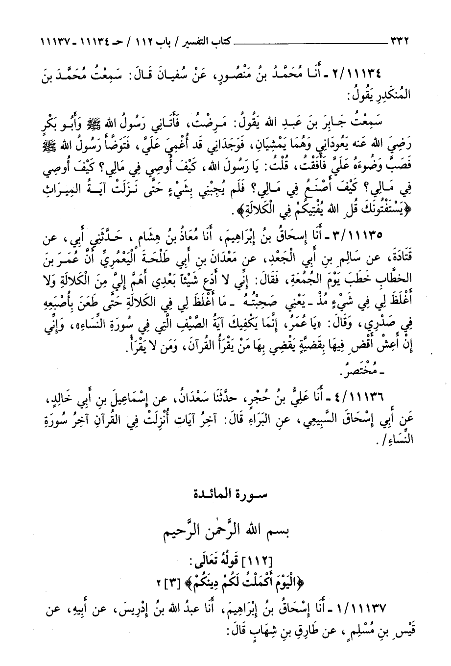 11136 - أنا علي بن حجر حدثنا سعدان عن إسماعيل بن أبي خالد عن أبي إسحاق السبيعي عن البراء قال : آخر آيات أنزلت في القرآن آخر سورة النساء
