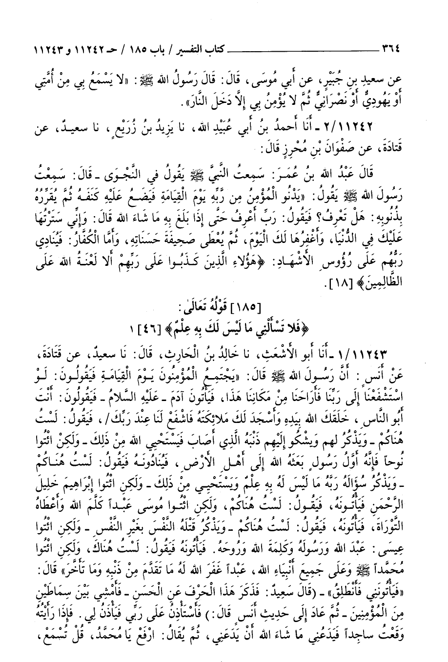 11243 - أنا أبو الأشعث نا خالد بن الحارث قال نا سعيد عن قتادة عن أنس أن رسول الله صلى الله عليه و سلم قال : يجتمع المؤمنون يوم القيامة فيقولون لو استشفعنا إلى ربنا فأراحنا من مكاننا هذا فيأتون آدم عليه السلام فيقولون أنت أبو الناس خلقك الله بيده وأسجد لك ملائكته فاشفع لنا عند ربك فيقول لست هناكم ويذكر لهم ويشكو إليهم ذنبه الذي أصاب فيستحيي الله من ذلك ولكن ائتوا نوحا فإنه أول رسول بعثه الله إلى أهل الأرض فينادونه فيقول لست هناكم ويذكر سؤاله ربه ما ليس له به علم ويستحيي من ذلك ولكن ائتوا إبراهيم خليل الرحمن فيأتونه فيقول لست هناكم ولكن ائتوا موسى عبدا كلم الله وأعطاه التوراة فيأتونه فيقول لست هناكم ويذكر قتله النفس بغير النفس ولكن ائتوا عيسى عبد الله ورسوله وكلمه الله وروحه فيأتونه فيقول لست هناك ولكن ائتوا محمدا صلى الله عليه و سلم وعلى جميع أنبياء الله عبدا غفر الله له ما تقدم من ذبه وما تأخر قال فيأتونني فأنطلق قال سعيد فذكر هذا الحرف عن الحسن فأمشي بين سماطين من المؤمنين ثم عاد إلى حديث أنس قال فأستأذن على ربي فيأذن لي فإذا رأيته وقعت ساجدا فيدعني ما شاء الله أن يدعني ثم يقال ارفع يا محمد قل تسمع سل تعطه اشفع تشفع فأرفع رأسي فأحمده بتحميد يعلمنيه ثم أشفع فيحد لي حدا فيدخلهم الجنة ثم أعود الثانية فإذا رأيته وقعت ساجدا فيدعني ما شاء الله أن يدعني ثم يقال ارفع يا محمد قل تسمع سل تعطه اشفع تشفع فأرفع رأسي فأحمده بتحميد يعلمنيه ثم أشفع فيحد لي حدا فيدخلهم الجنة ثم أعود الثالثة فإذا رأيت ربي وقعت له ساجدا فيدعني ما شاء الله ثم يقال لي ارفع يا محمد قل تسمع سل تعطه اشفع تشفع فأرفع رأسي فأحمده بتحميد يعلمنيه ثم أشفع فيحد لي حدا فيدخلهم الجنة ثم أعود الرابعة فأقول يا رب ما بقي إلا من حبسه القرآن قال ويقول قتادة على أثر هذا الحديث حدثنا أنس بن مالك أن رسول الله صلى الله عليه و سلم قال يخرج من النار من قال لا إله إلا الله وكان في قلبه من الإيمان مثقال شعيرة من خير ويخرج من النار من قال لا إله إلا الله وكان في قلبه مثقال برة من خير ويخرج عن النار من كان في قلبه مثقال ذرة من خير