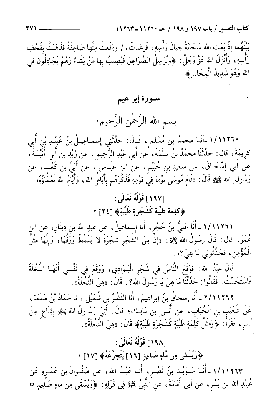 11262 - أنا إسحاق بن إبراهيم أنا النضر بن شميل نا حماد بن سلمة عن شعيب بن الحباب عن أنس بن مالك قال : أتي رسول الله صلى الله عليه و سلم بقناع من بسر فقرأ ومثل كلمة طيبة كشجرة طيبة قال هي النخلة