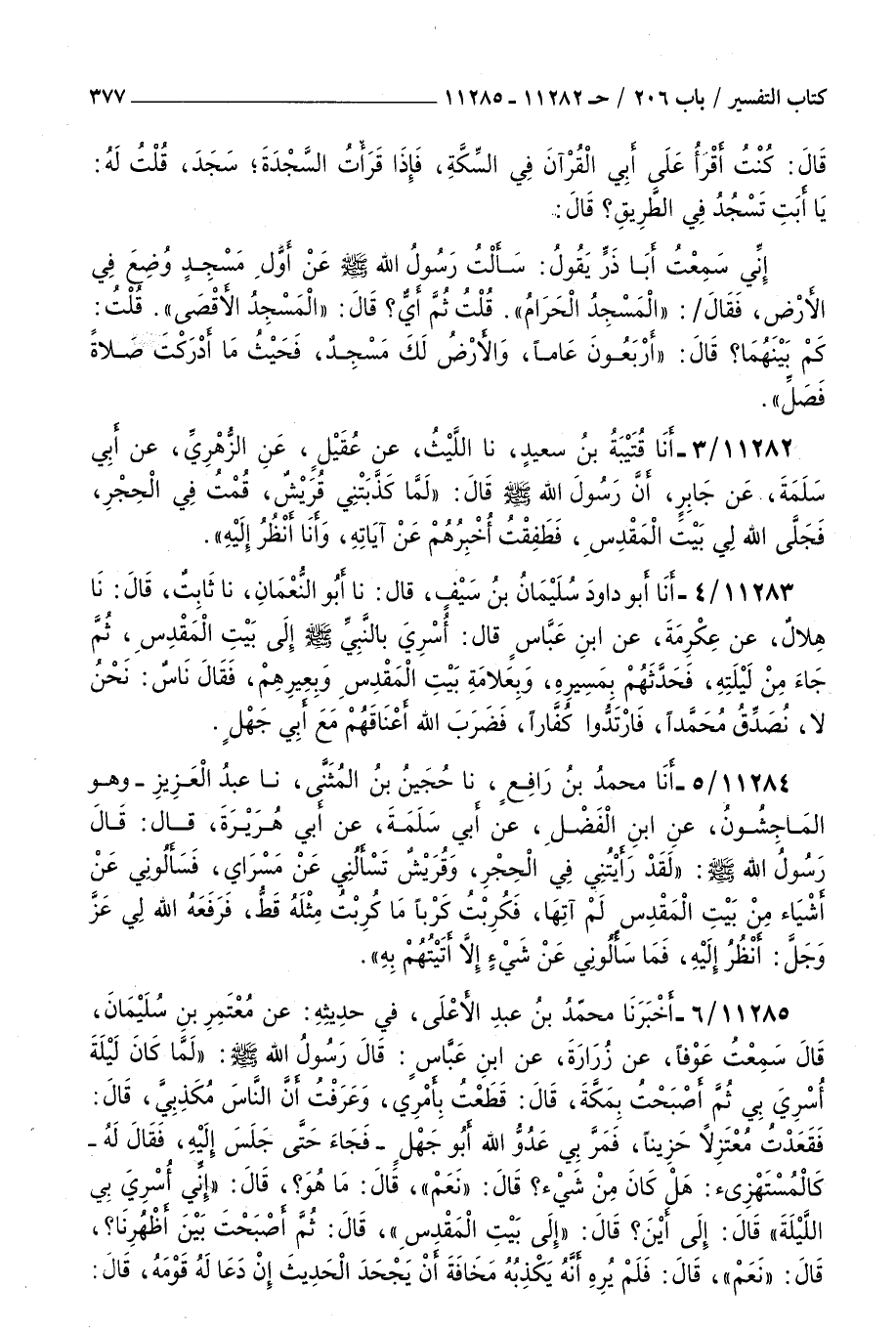 11282 - أنا قتيبة بن سعيد نا الليث عن عقيل عن الزهري عن أبي سلمة عن جابر أن رسول الله صلى الله عليه و سلم قال : لما كذبتني قريش قمت في الحجر فجلى الله لي بيت المقدس فطفقت أخبرهم عن آياته وأنا أنظر إليه