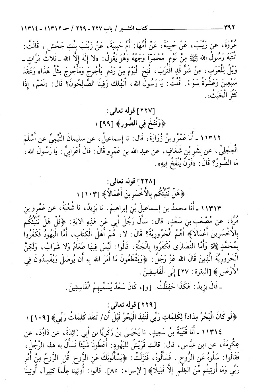 11313 - أنا محمد بن إسماعيل بن إبراهيم نا يزيد نا شعبة عن عمرو بن مرة عن مصعب بن سعد قال : سأل رجل أبي عن هذه الآية { قل هل ننبئكم بالأخسرين أعمالا } أهم الحرورية قال لا هم أهل الكتاب أما اليهود فكفروا بمحمد صلى الله عليه و سلم وأما النصارى فكفروا بالجنة قالوا ليس فيها طعام ولا شراب ولكن الحرورية الذين قال الله عز و جل ويقطعون ما أمر الله به أن يوصل ويفسدون في الأرض إلى الفاسقين قال يزيد هكذا حفظت وكان سعد يسميهم الفاسقين