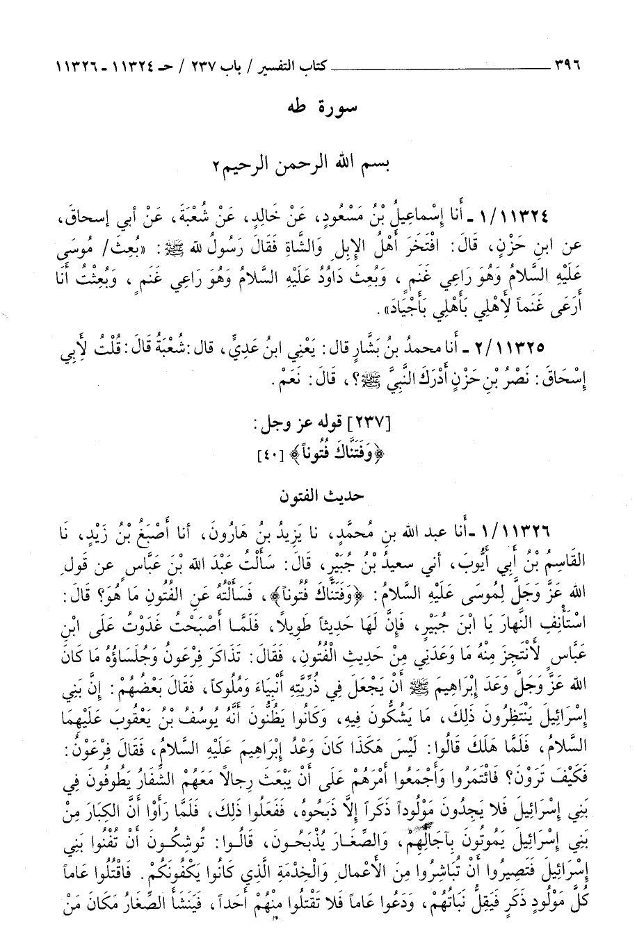 11326 - أنا عبد الله بن محمد نا يزيد بن هارون أنا أصبغ بن زيد نا القاسم بن أبي أيوب أني سعيد بن جبير قال : سألت عبد الله بن عباس عن قول الله عز و جل لموسى عليه السلام وفتناك فتونا فسألته عن الفتون ما هو قال استأنف النهار يا بن جبير فأن لها حديثا طويلا فلما أصبحت غدوت على بن عباس لأنتجز منه ما وعدني من حديث الفتون فقال تذاكر فرعون وجلساؤه ما كان الله عز و جل وعد إبراهيم صلى الله عليه و سلم أن يجعل في ذريته أنبياء وملوكا قال بعضهم إن بني إسرائيل ينتظرون ذلك ما يشكون فيه وكانوا يظنون أنه يوسف بن يعقوب عليهما السلام فلما هلك قالوا ليس هكذا كان وعد إبراهيم عليه السلام فقال فرعون فكيف ترون فائتمروا وأجمعوا أمرهم على أن يبعث رجالا معهم الشفار يطوفون في بني إسرائيل فلا يجدون مولودا ذكرا إلا ذبحوه ففعلوا ذلك فلما رأوا أن الكبار من بني إسرائيل يموتون بآجالهم والصغار يذبحون قالوا توشكون أن تفنوا بني إسرائيل فتصيروا أن تباشروا من الأعمال والخدمة الذي كانوا يكفونكم فاقتلوا عاما كل مولود ذكر فيقل نباتهم ودعوا عاما فلا تقتلوا منهم أحدا فينشأ الصغار مكان من [ ص 397 ] يموت من الكبار فإنهم لن يكثروا بمن تستحيون منهم فتخافوا مكاثرتهم إياكم ولن يفنوا بمن تقتلون وتحتاجون إليهم فأجمعوا أمرهم على ذلك فحملت أم موسى بهارون في العام الذي لا يذبح فيه الغلمان فولدته علانية آمنة فلما كان من قابل حملت بموسى فوقع في قلبها الهم والحزن وذلك من الفتون يا بن جبير ما دخل عليه في بطن أمه مما يراد به فأوحى الله جل ذكره إليها أن لا تخافي ولا تحزني إنا رادوه إليك وجاعلوه من المرسلين فأمرها إذا ولدت أن تجعله في تابوت وتلقيه في اليم فلما ولدت فعلت ذلك فلما توارى عنها ابنها أتاها الشيطان فقالت في نفسها ما فعلت بابني لو ذبح عندي فواريته وكفنته كان أحب إلي أن ألقيه إلى دواب البحر وحيتانه فانتهى الماء به حتى أوفي به عند فرضه مستقى جواري امرأة فرعون فلما رأينه أخذنه فهممن أن يفتحن التابوت فقال بعضهن إن في هذا مالا وإنا إن فتحناه لم تصدقنا امرأة الملك بما وجدنا فيه فحملنه كهيئته لم يخرجن منه شيئا حتى دفعنه إليها فلما فتحته رأت فيه غلاما فألقي عليها منه محبة لم يلق منها على أحد قط وأصبح فؤاد أم موسى فارغا من ذكر كل شيء إلا من ذكر موسى فلما سمع الذباحون بأمره أقبلوا بشفارهم إلى امرأة فرعون ليذبحوه وذلك من الفتون يا بن جبير فقالت لهم أقروه فإن هذا الواحد لا يزيد في بني إسرائيل حتى آتي فرعون فأستوهبه منه فإن وهبه لي كنتم قد أحسنتم وأجملتم وإن أمر بذبحه لم ألمكم فأتت فرعون فقالت قرة عين لي ولك فقال فرعون يكون لك فأما لي فلا حاجة لي فقال رسول الله صلى الله عليه و سلم والذي يحلف به لو أقر فرعون أن يكون له قرة عين كما أقرت امرأته لهداه الله كما هداها ولكن الله حرمه ذلك فأرسلت إلى من حولها إلى كل امرأة لها لبن تختار له ظئرا فجعل كلما أخذته امرأة منهن لترضعه لم يقبل على ثديها حتى أشفقت امرأة فرعون أن يمتنع من اللبن فيموت فأحزنها ذلك فأمرت به فأخرج إلى السوق ومجمع الناس ترجو أن تجد له ظئرا تأخذه منها فلم يقبل فأصبحت أم موسى والها فقالت لأخته قصي أثره واطلبيه هل تسمعين له ذكرا أحي ابني أم أكلته الدواب ونسيت ما كان الله وعدها فيه فبصرت به أخته عن جنب والجنب أن يسو بصر الإنسان إلى الشيء البعيد وهو إلى ناحية لا يشعر به فقالت من الفرح حين أعياهم الظؤورات أنا أدلكم على أهل بيت يكفلونه [ ص 398 ] لكم وهم له ناصحون فأخذوها فقالوا ما يدريك ما نصحهم هل تعرفونه حتى شكوا في ذلك وذلك من الفتون يا بن جبير فقالت نصيحتهم له وشفقتهم عليه رغبتهم في صهر الملك ورجاء منفعة الملك فأرسلوها فانطلقت إلى أمها فأخبرتها الخبر فجاءت أمه فلما وضعته في حجرها ثوى إلى ثديها فمصه حتى امتلأ جنباه ريا وانطلق البشراء إلى امرأة فرعون يبشرونها أن قد وجدنا لابنك ظئرا فأرسلت إليها فأتت بها وبه فلما رأت ما يصنع قالت امكثي ترضعي ابني هذا فإني لم أحب شيئا حبه قط قالت أم موسى لا أستطيع 