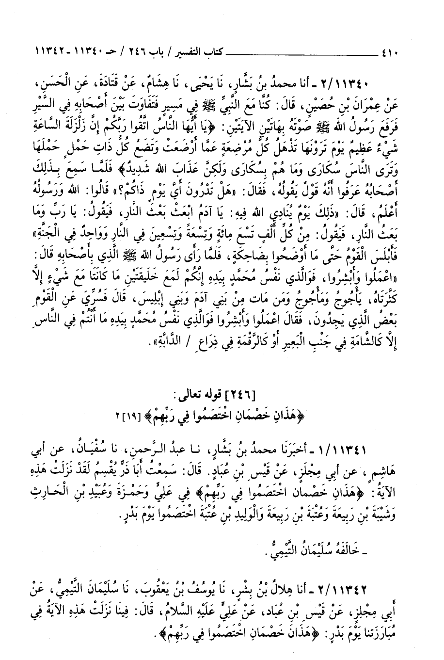 11342 - أنا هلال بن بشر نا يوسف بن يعقوب نا سليمان التيمي عن أبي مجلز عن قيس بن عباد عن علي عليه السلام قال : فينا نزلت هذه الآية في مبارزتنا يوم بدر { هذان خصمان اختصموا في ربهم }