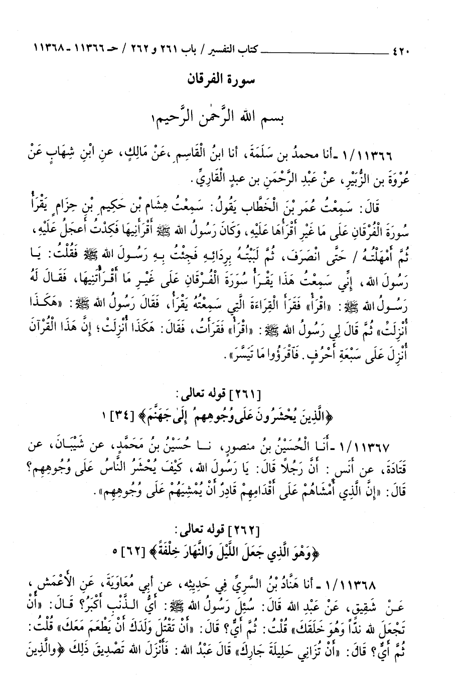 11366 - أنا محمد بن سلمة أنا بن القاسم عن مالك عن بن شهاب عن عروة بن الزبير عن عبد الرحمن بن عبد القاري قال سمعت عمر بن الخطاب يقول : سمعت هشام بن حكيم بن حزام يقرأ سورة الفرقان على ما غير أقرأها عليه وكان رسول الله صلى الله عليه و سلم أقرأنيها فكدت أعجل عليه ثم أمهلته حتى انصرف ثم لببته بردائه فجئت به رسول الله صلى الله عليه و سلم فقلت يا رسول الله إني سمعت هذا يقرأ سورة الفرقان على غير ما أقرأتنيها فقال له رسول الله صلى الله عليه و سلم اقرأ فقرأ القراءة التي سمعته يقرأ فقال رسول الله صلى الله عليه و سلم هكذا أنزلت ثم قال لي رسول الله صلى الله عليه و سلم اقرأ فقرأت فقال هكذا أنزلت إن هذا القرآن أنزل على سبعة أحرف فاقرؤوا ما تيسر
