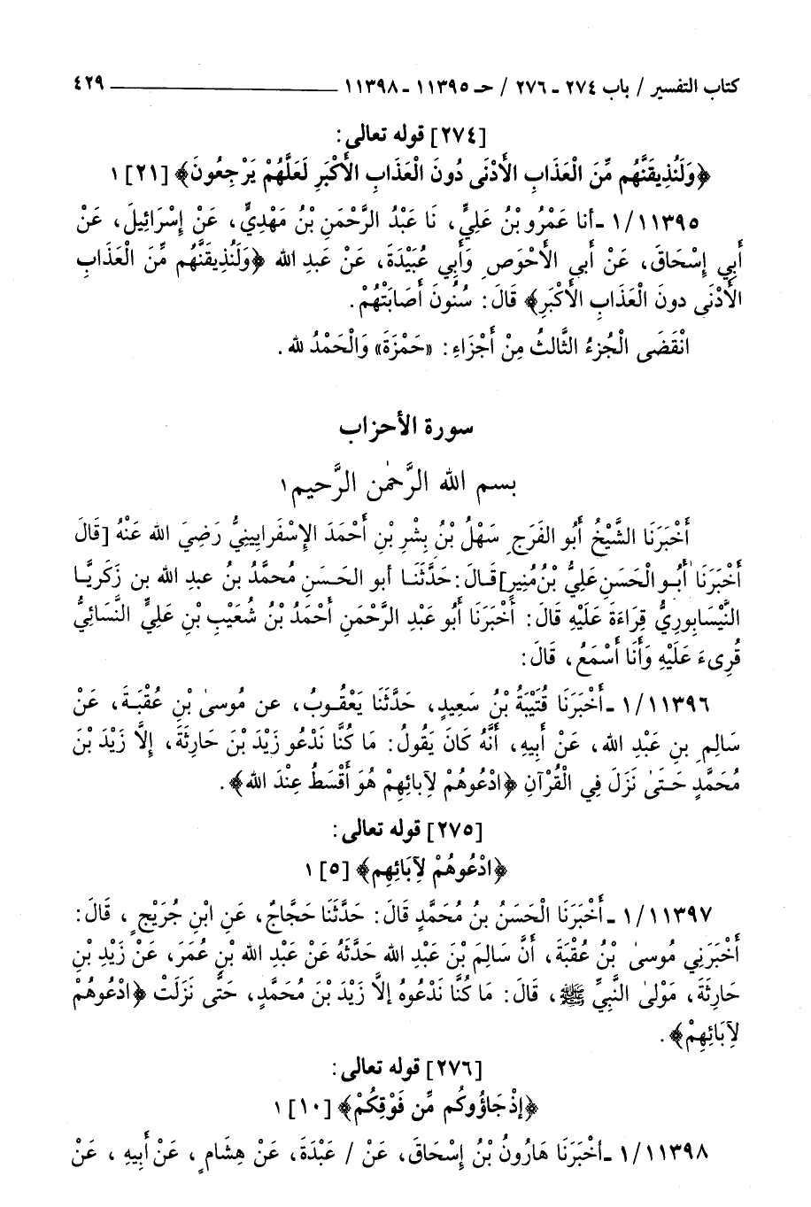 11396 - أخبرنا قتيبة بن سعيد حدثنا يعقوب عن موسى بن عقبة عن سالم بن عبد الله عن أبيه أنه كان يقول : ما كنا ندعو زيد بن حارثة إلا زيد بن محمد حتى نزل في القرآن { ادعوهم لآبائهم هو أقسط عند الله }